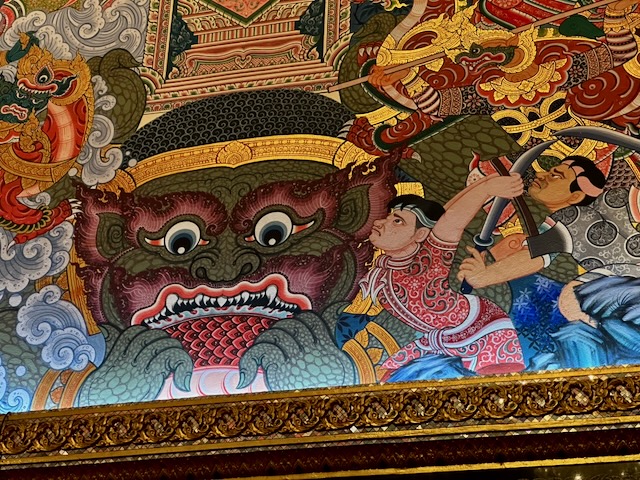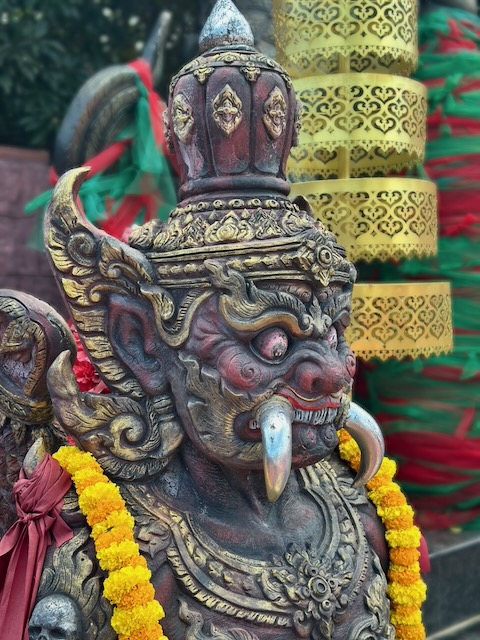 Wir besuchen den buddhistischen Tempel Wat Bang Krasop und den Maha Dewalai Hindu Tempel, wo wir von Alexander viel über Buddha, Mönche und hinduistische Götter erfahren. Die buddhistische Zeitrechnung beginnt mit dem Tod Buddhas, das war 543 Jahre vor Christi Geburt. Das Jahr 2025 ist also in Thailand 2568. Von den Hindu Gottheiten lernen wir Ganesha, Brahma, Shiva, Vishnu und Naga kennen.