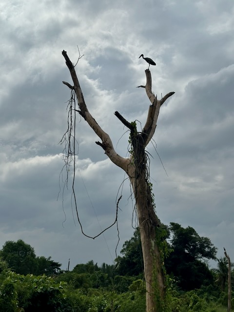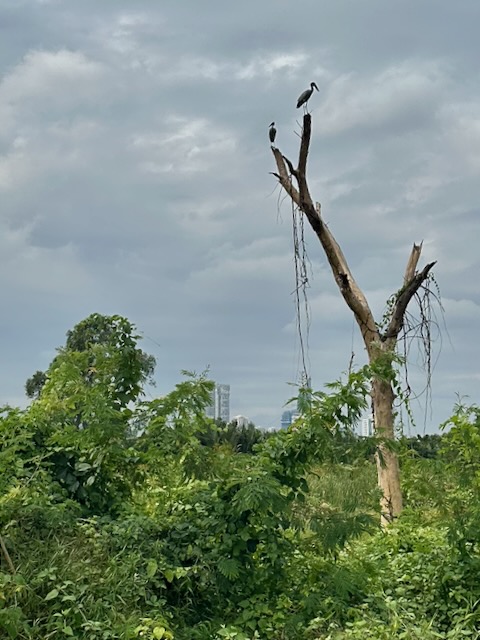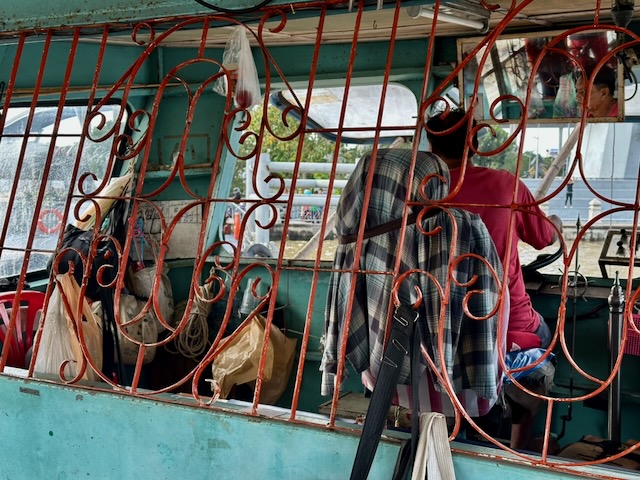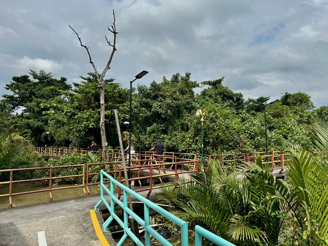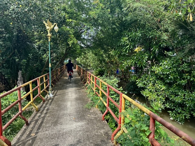 Um 8 Uhr geht es dann los mit zwei weiteren Teilnehmern, T. und E. aus Belgien und unserem vielsprachigen Guide Alexander. Wir fahren mit den Velos zur Fähre und überqueren den Chao Praya Fluss. Jetzt sind wir auf Bang Kachao, einer künstlichen Insel in einer Flussschleife. Insel wird das Land genannt, weil es in der Flussschleife einen Kanal gibt, der das Land von der Umgebung trennt. Die Insel ist 16 km² gross und wird vor allem landwirtschaftlich genutzt. Sie wird von Strassen und Radwegen durchzogen. Es ist ein beliebter Ausflugsort ins Grüne für die Grossstadtbewohner. Gerade hat eine Laufveranstaltung stattgefunden, und es hat noch viele Läufer mit ihren Finisher T-Shirts.
