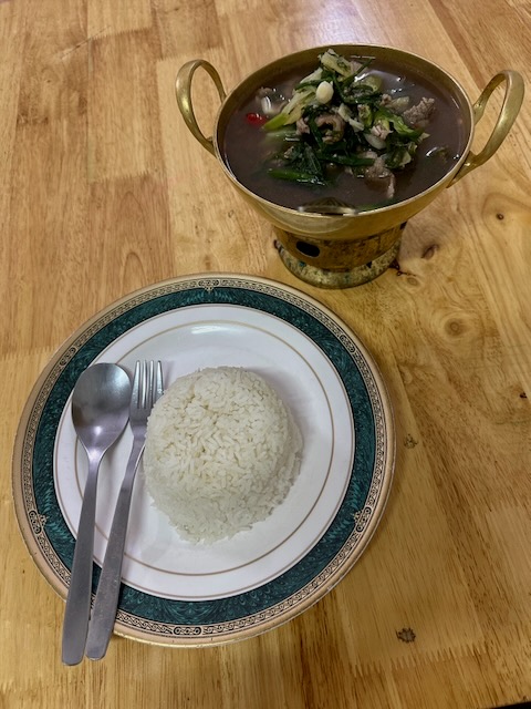 Nun geht es weiter durch den Sri Nakhon Khuean Khan Park. Im Thai Boxing Gym erhalten wir eine Einführung ins Thai Boxen. Im Restaurant White Elephant gibt es Mittagessen. Mit der Fähre geht es wieder zurück auf die andere Seite und mit Grab (162 Baht) fahre ich zurück zum Hotel. Gleich nebenan ist das Restaurant Bakprik, wo ich das Beefcurry with Lemongrass geniesse (mit Reis und Getränk 100 Baht).