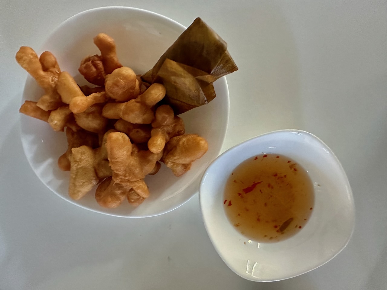 Zum Frühstück bringt mir mein Vermieter Pa Tong Go, das ist frittierter Teig, ähnlich den Churros in Spanien. Dazu zwei Khao Tom Mad, Klebreis mit Bohnen im Bananenblatt.