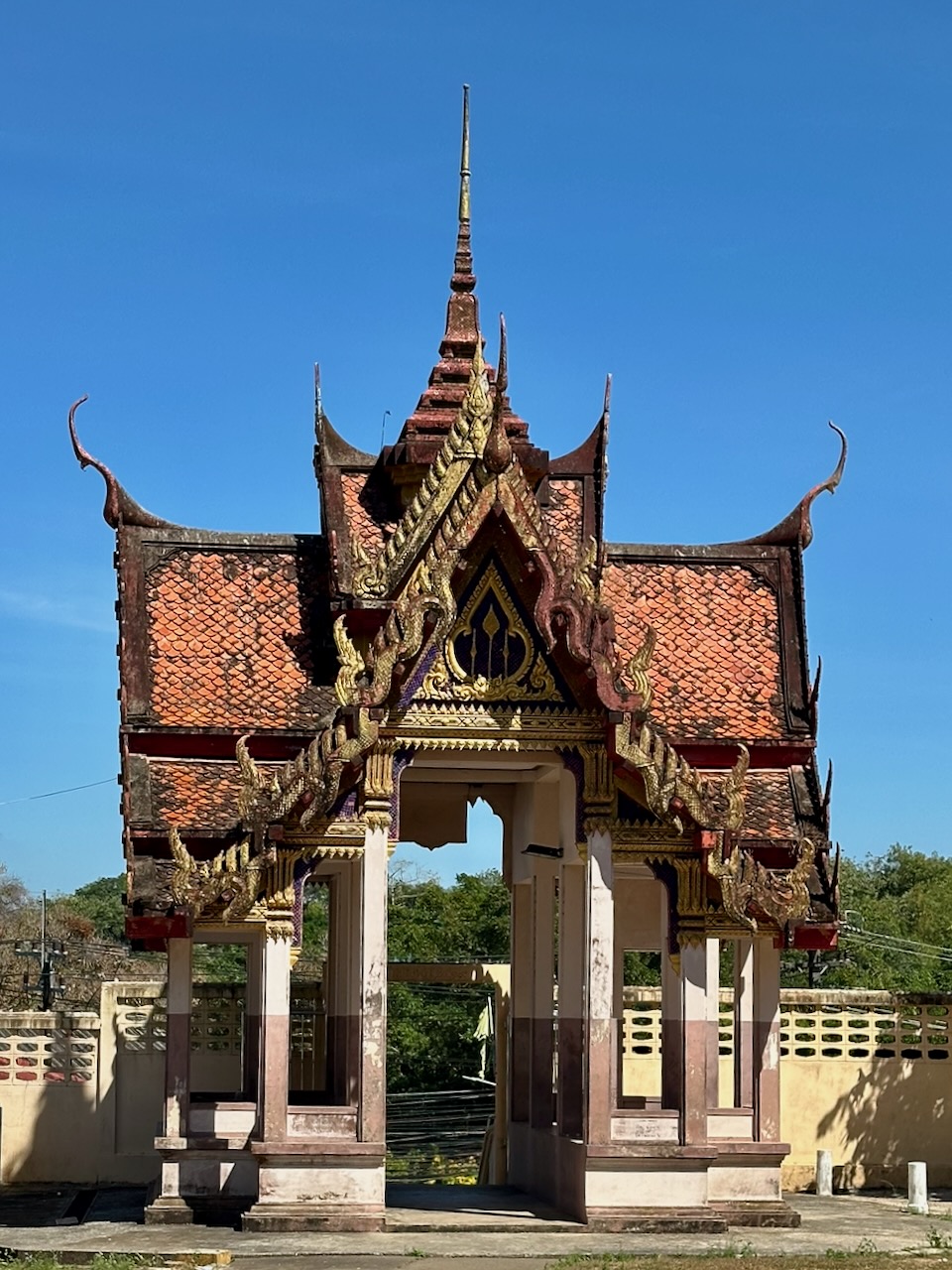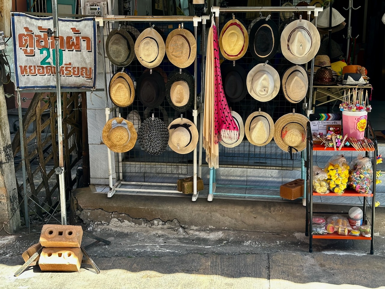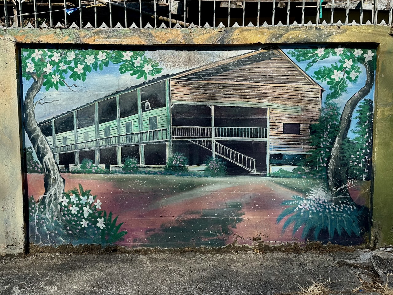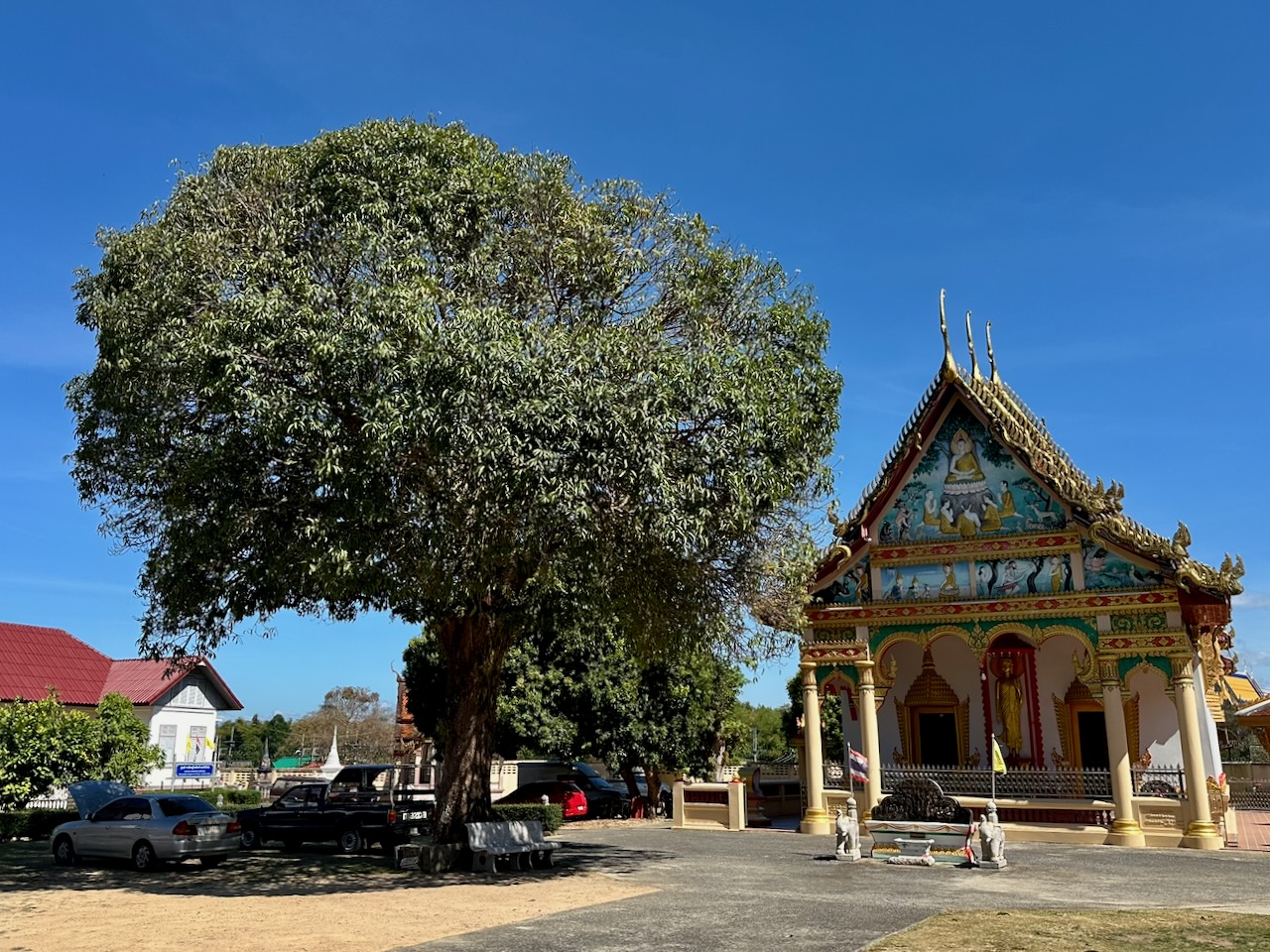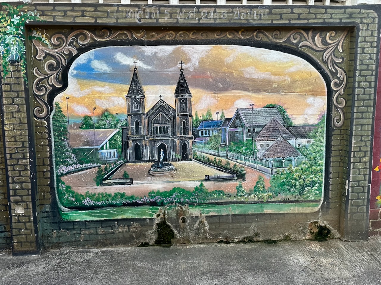Für den nächsten Programmpunkt muss ich morgen wiederkommen, der Edelsteinladen hat am Montag zu. Ich schaue mir noch den Tempel Wat Bot Muang an. Auf dem Weg zurück zum Fluss komme ich an grossen Geschäften für Landmaschinen vorbei, wo es wirklich alles gibt. Im Tante Mais Nudelsuppenladen /Pa Mai Guay Jub Restaurant) esse ich Kui-jab: Reisnudeln in brauner Suppe. mit Ei, Huhn, Innereien und Blutwurst, und im Chanthabooncafe trinke ich Kaffee. Im Edelsteinladen Maneechai kaufe ich als Mitbringsel 5 Schlüsselanhänger mit kleinen Gläsern, welche mit Halbedelsteinen gefüllt sind. Ich wandere zurück zur Kathedrale, auf dieser Seite des Flusses gibt es auch einen Rundgang, welcher zu verschiedenen Essens-Orten und einem Museum führt, welche aber alle zu sind. Aber die Gegend ist malerisch und vielfältig, gegessen habe ich ja eh schon genug. Eine Allee voller Graffiti, farbig und lebendig rundet den Spaziergang ab.