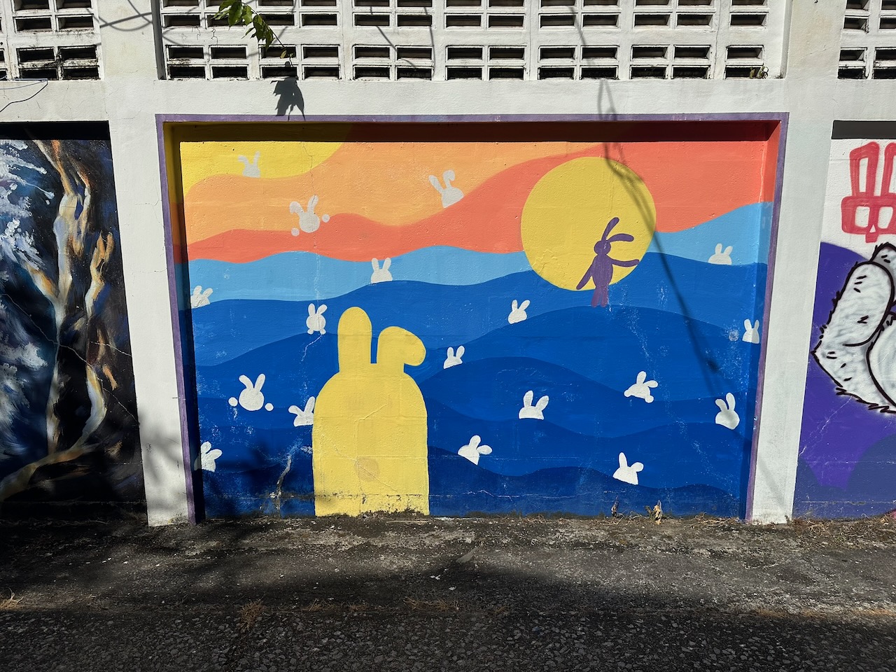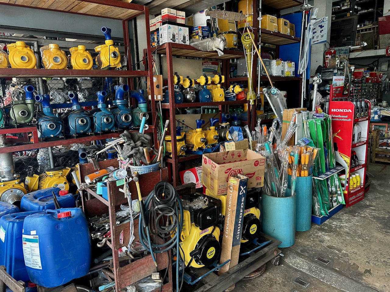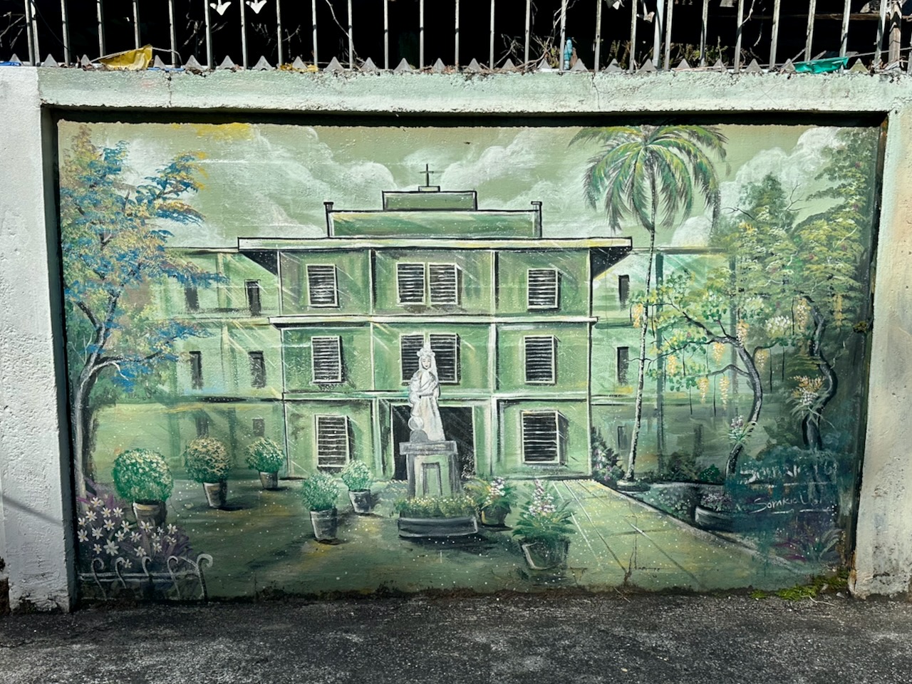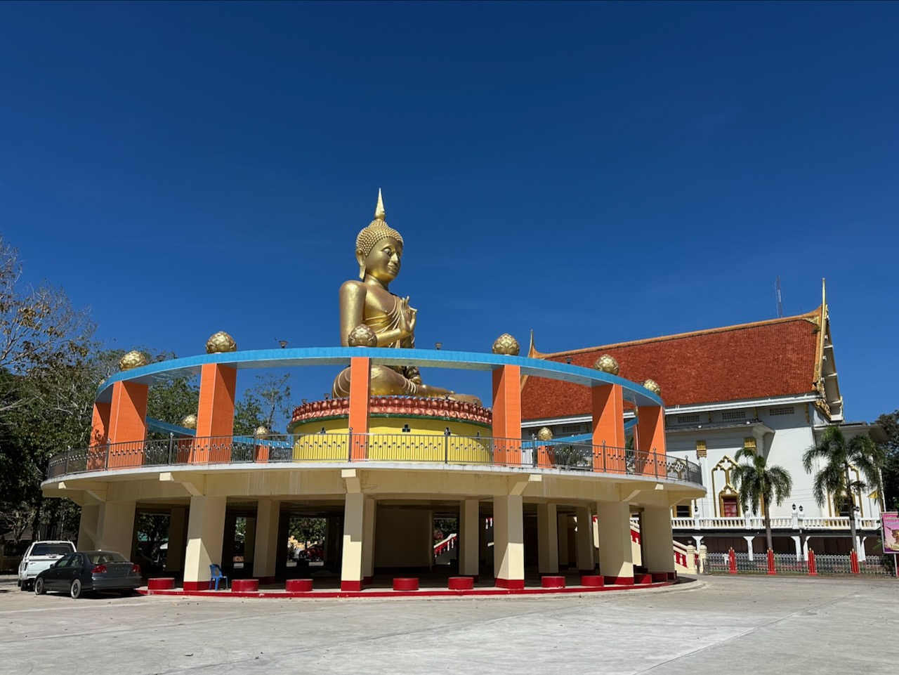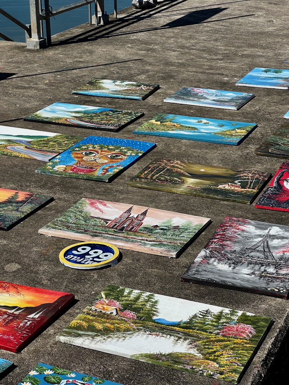 Für den nächsten Programmpunkt muss ich morgen wiederkommen, der Edelsteinladen hat am Montag zu. Ich schaue mir noch den Tempel Wat Bot Muang an. Auf dem Weg zurück zum Fluss komme ich an grossen Geschäften für Landmaschinen vorbei, wo es wirklich alles gibt. Im Tante Mais Nudelsuppenladen /Pa Mai Guay Jub Restaurant) esse ich Kui-jab: Reisnudeln in brauner Suppe. mit Ei, Huhn, Innereien und Blutwurst, und im Chanthabooncafe trinke ich Kaffee. Im Edelsteinladen Maneechai kaufe ich als Mitbringsel 5 Schlüsselanhänger mit kleinen Gläsern, welche mit Halbedelsteinen gefüllt sind. Ich wandere zurück zur Kathedrale, auf dieser Seite des Flusses gibt es auch einen Rundgang, welcher zu verschiedenen Essens-Orten und einem Museum führt, welche aber alle zu sind. Aber die Gegend ist malerisch und vielfältig, gegessen habe ich ja eh schon genug. Eine Allee voller Graffiti, farbig und lebendig rundet den Spaziergang ab.