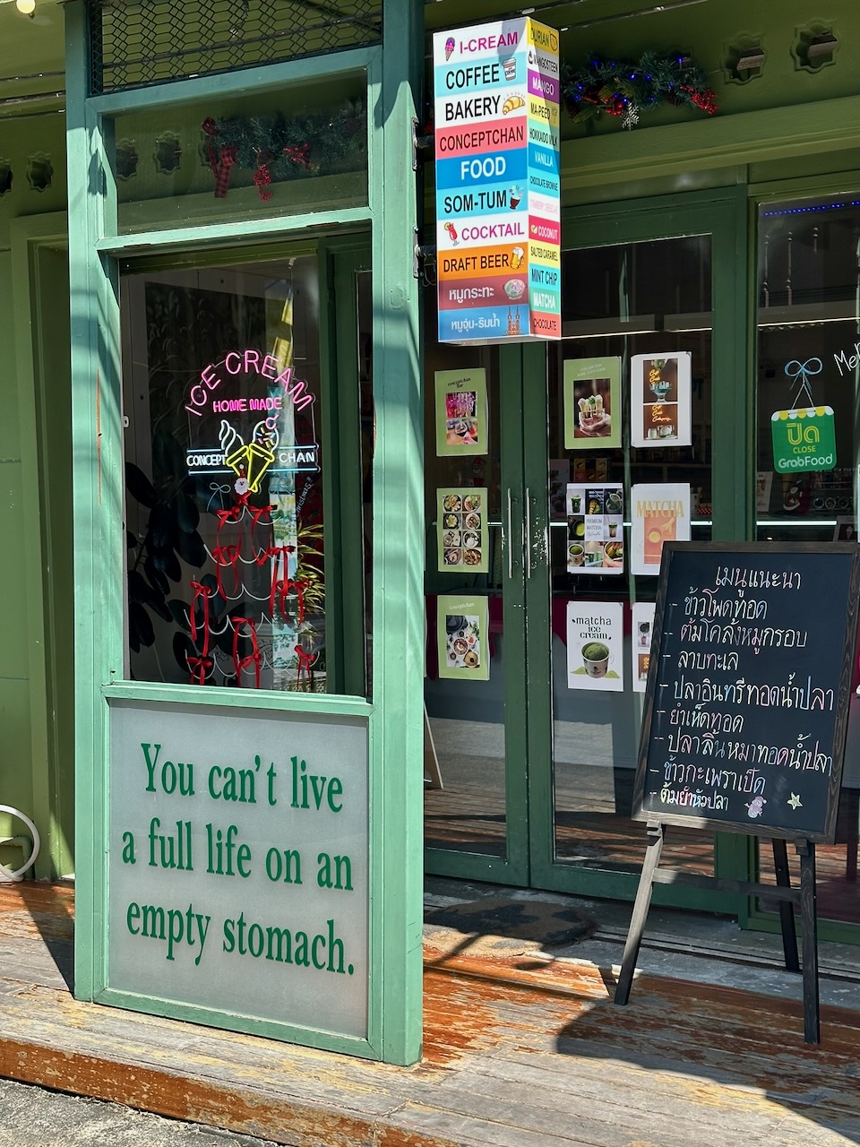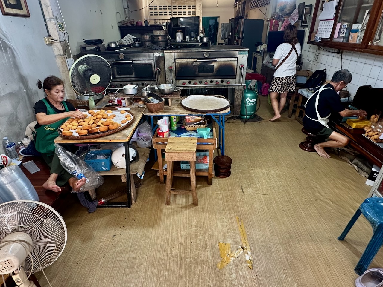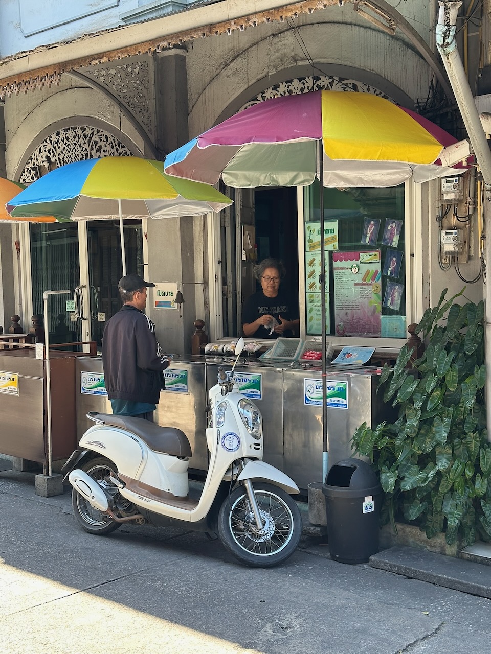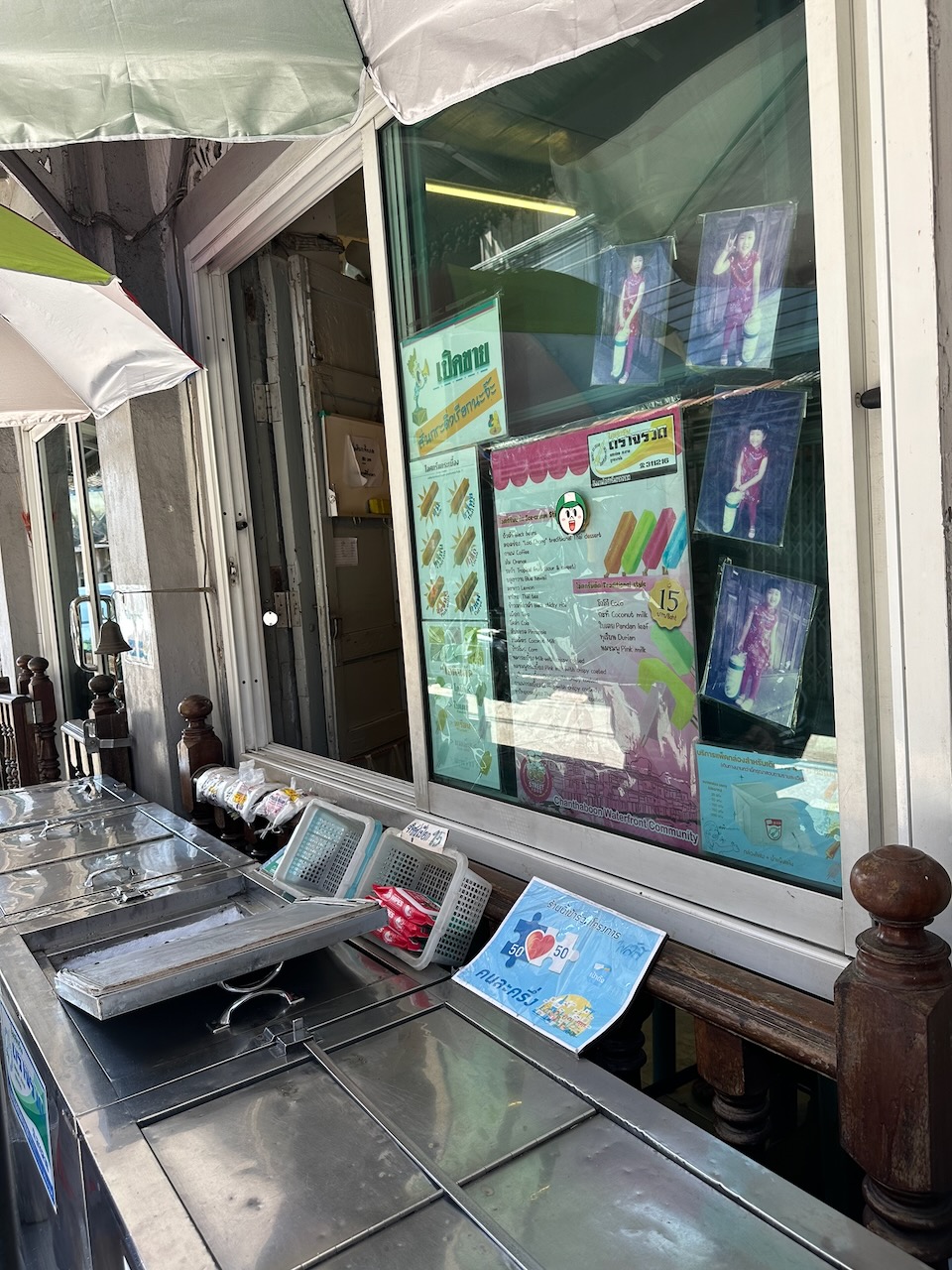 Die erste Station wäre der Edelsteinmarkt, der ist aber nur am Wochenende geöffnet. Darum beginne ich mit Pa Tai Egg Cake, wo feine Madeleines hergestellt werden. Das Community Learning Center ist geschlossen, das Café lasse ich aus, aber beim Luang Rajamaitri Historic Inn schaue ich rein, wo es einige Schätze zu sehen gibt aus den Zeiten der East Asiatic Company. Nicht weit davon ist der Rocket Ice Cream Shop, welcher hier seit 50 Jahren Glacé verkauft. Ich probiere das Durian-Eis (15 Baht).