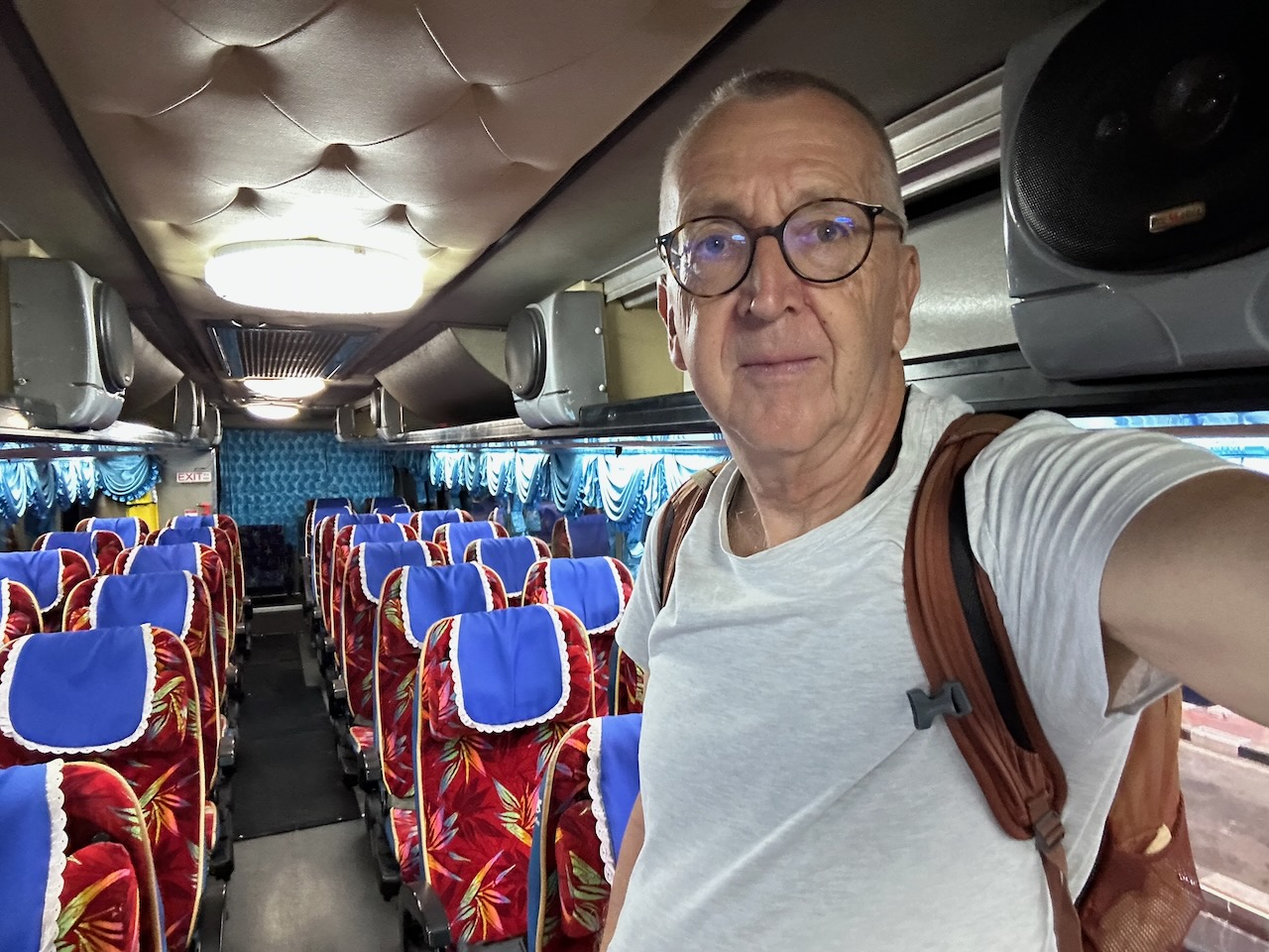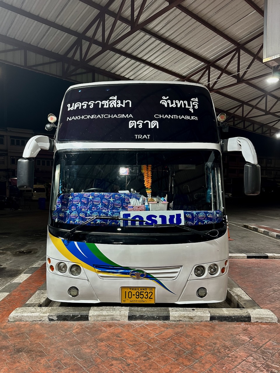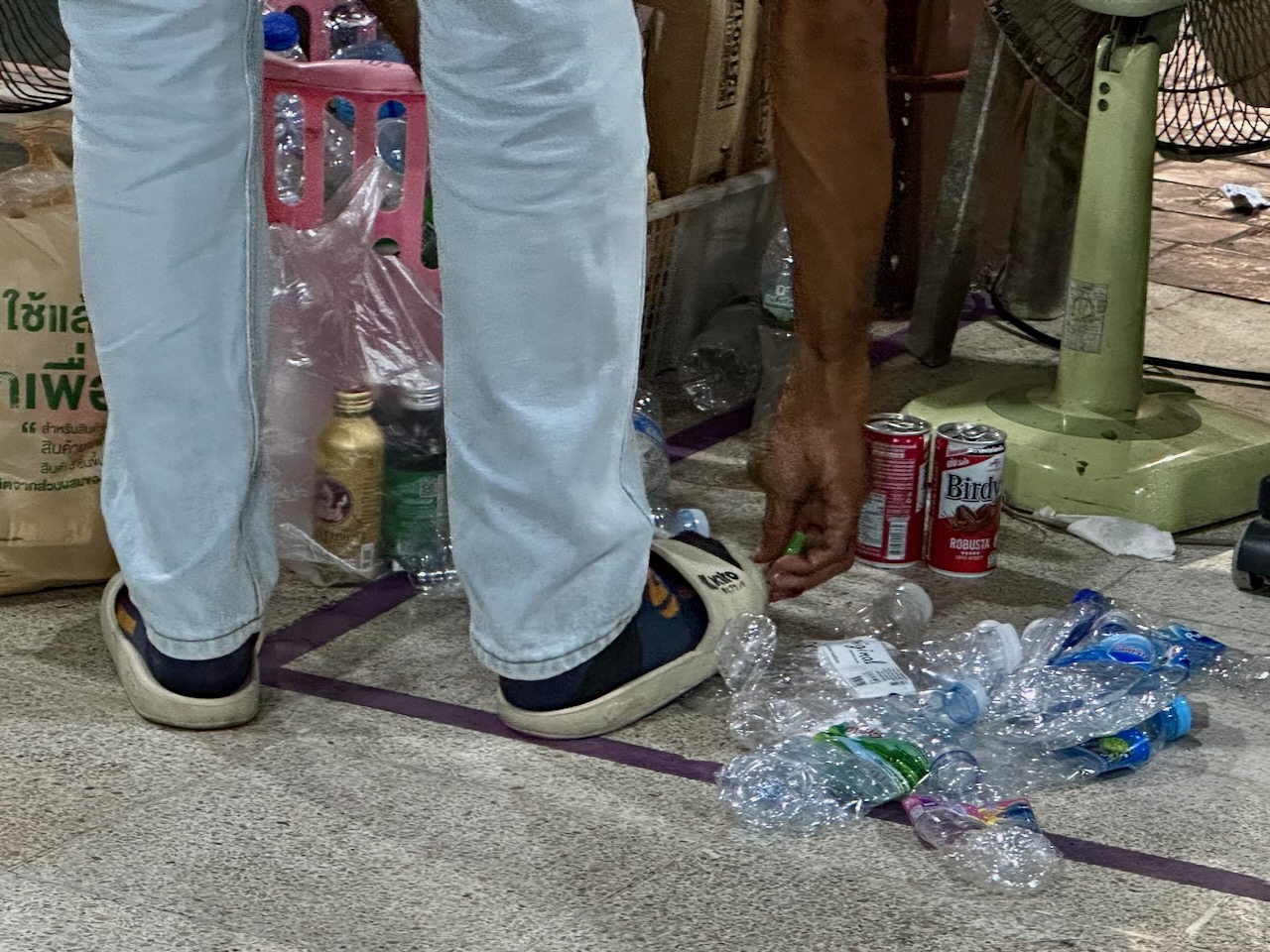 Mein Grab Taxi ist schon um 4.45 bereit, also steige ich ein für die Fahrt zum Busbahnhof (138 Baht). Der Bus nach Nakhon Ratchasima (Korat) steht schon bereit und sollte um 6 Uhr losfahren. Ich kaufe eine Fahrkarte für 310 Baht. Beim Warten she ich einem Mann zu, wie er Pet-Flaschen platt macht. Das ist also nicht nur eine Schweizer Eigenheit, ist ja auch vernünftig.