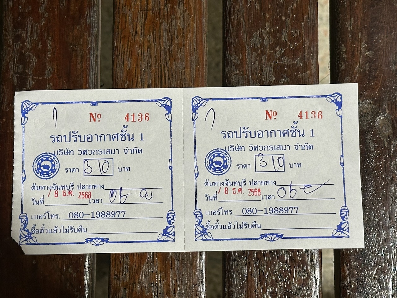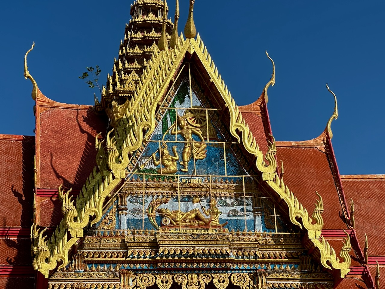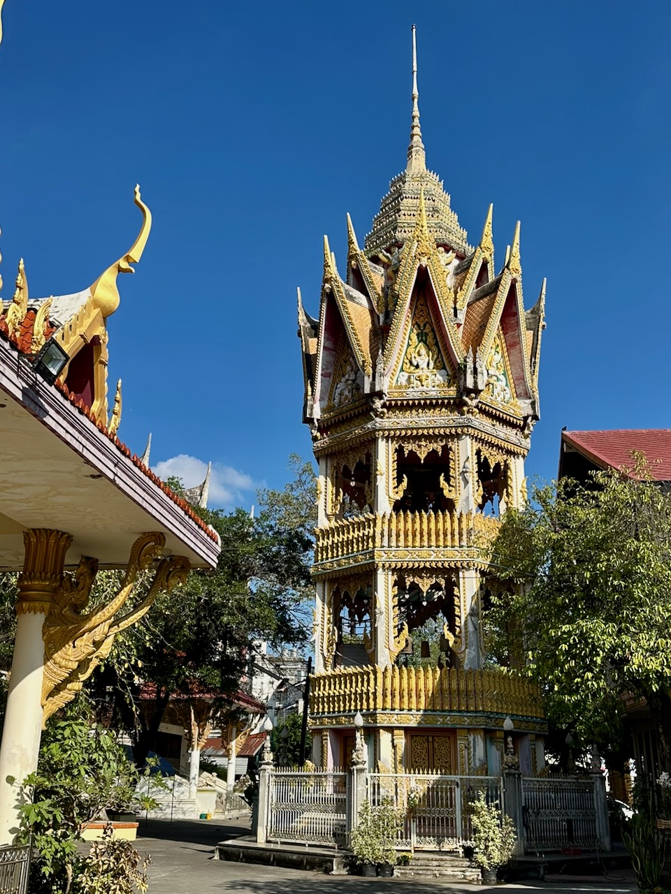 Alles ist grün, es wird viel angebaut, erkennen kann ich Bananen, Durian und Kardamom, auch an einer Erdbeerfarm kommen wir vorbei. Überall hat es kleine Dörfer und viele Holzhütten. Wir fahren durch grössere Ortschaften wie Pong Namron, Sai Khao und Pa Thong. Wir wechseln auf die Strasse 304, machen Mittagspause in ⁨der Kabin Buri Transport Station⁩ und erreichen Nakhon Ratchasima um 13.30. Ich nehme ein Taxi zum Sirihotel (120 Baht) und beziehe mein Zimmer. Gleich um die Ecke esse ich zu Mittag, dann spaziere ich auf der Suranree Road bis zum Suan Rak Park. Es hat einige schöne Tempel am Weg, da die Anlagen aber immer auch als Parkplatz genutzt werden, sind diese etwas schwierig zu fotografieren.