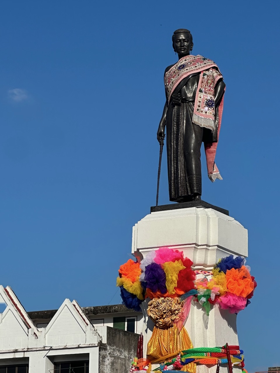 Im Park befindet sich der Chumphon Gate, ein Überbleibsel der Stadtmauer und das Thao Suranari Denkmal. Thao Suranari war die Ehefrau des Gouverneurs von Nakhon Ratchasima. Sie soll nach einer in Thailand verbreiteten Darstellung einen entscheidenden Beitrag zur Niederschlagung des Aufstandes des laotischen Königs Anuvong 1826 geleistet haben. In Korat wird sie als Lokalheldin verehrt. Im Touristenbüro erhalte ich eine englischsprachige Karte mit den Sehenswürdigkeiten und die Information, dass ich für meine Weiterreise am Sonntag zum Bus Terminal 2 gehen muss.