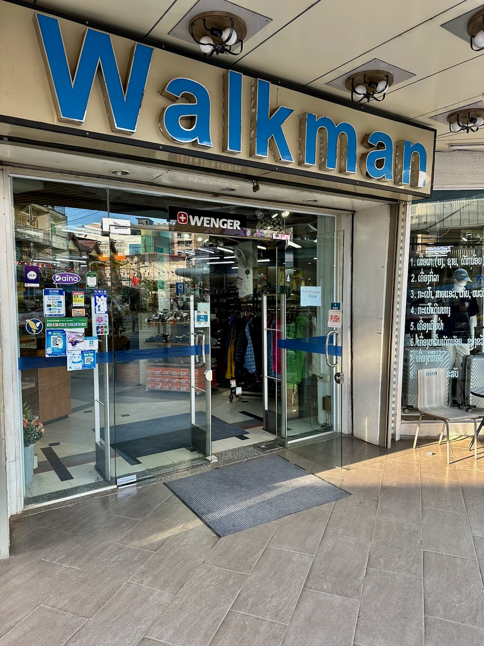 Am Nachmittag gehe ich in der A Je Kitchen essen, das Khao Soi Luang Prabang schmeckt anders als das in Chiang Mai, ist aber auch sehr gut. Nebenan entdecke ich das Warenhaus Walkman. Auf zwei Etagen gibt es Kopien bekannter Kleidermarken, Sonnenbrillen, Accessoires und Schuhe. Ich erstehe eine „Arcteryx“-Jacke, weil ich meine leichte Jacke nicht mitgebracht habe.