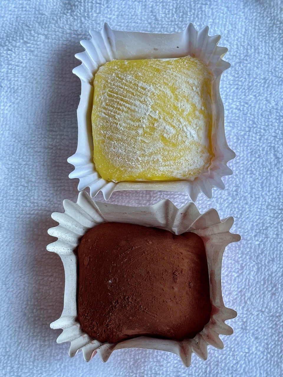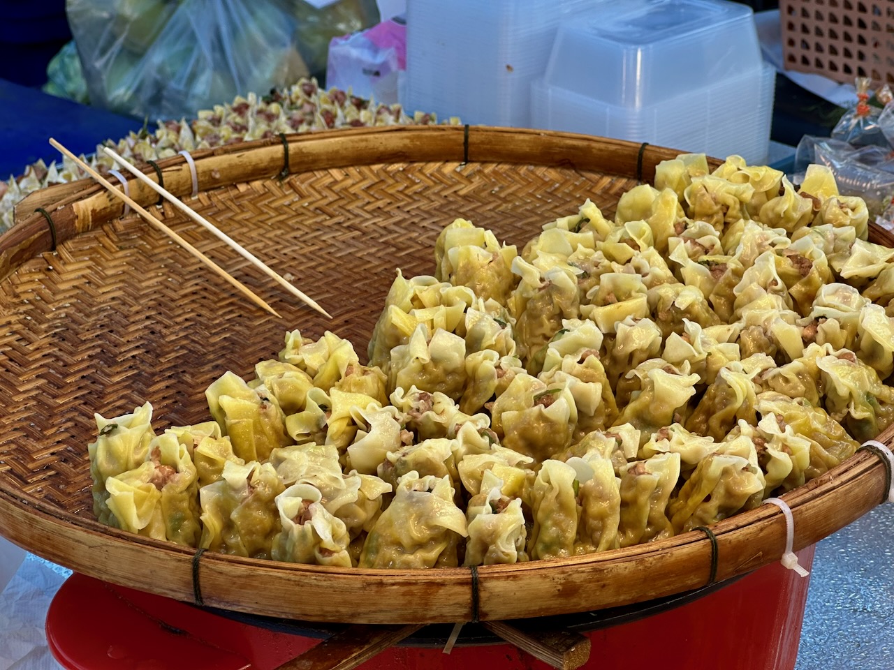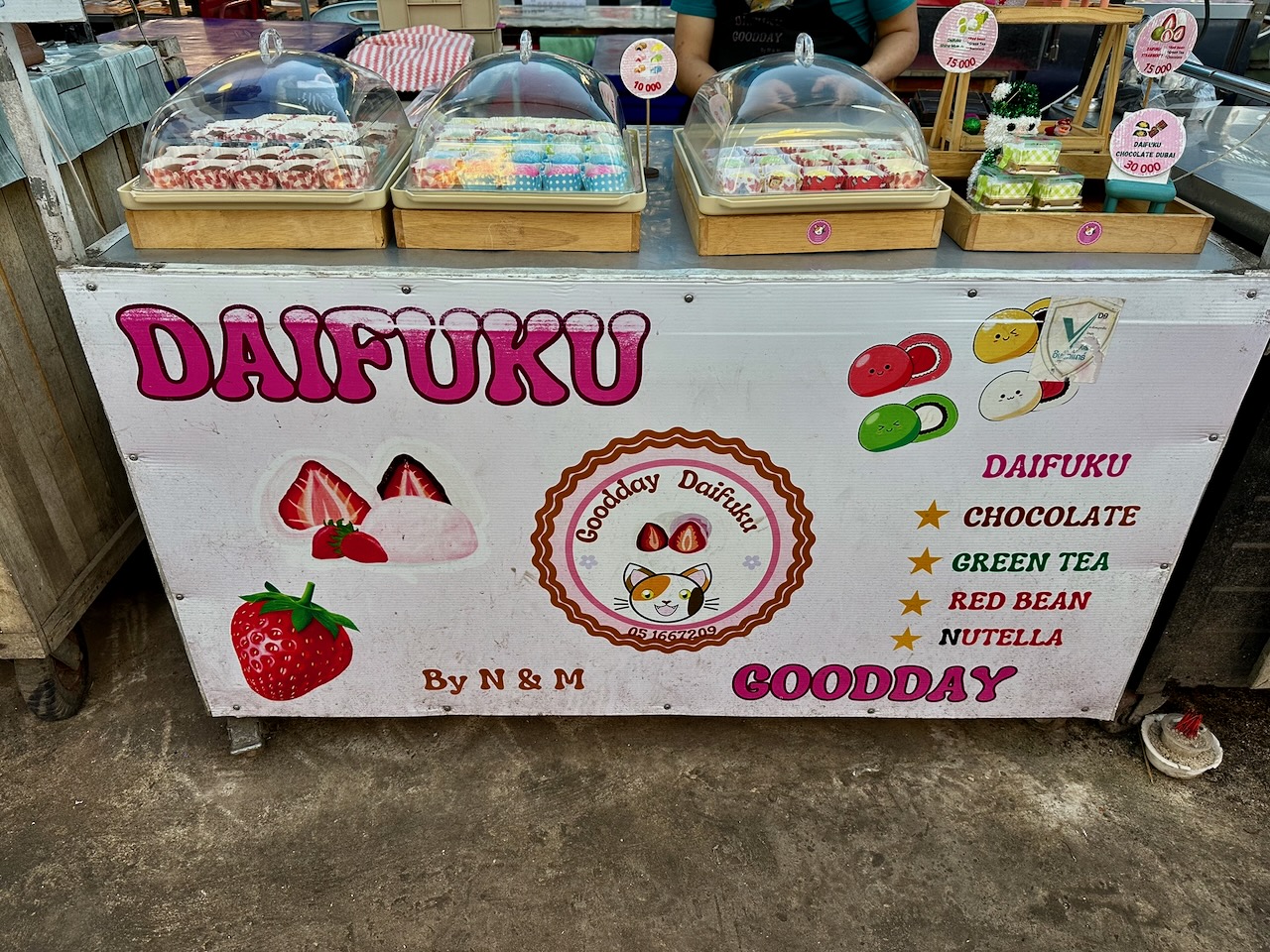 Ich besuche den Night Food Market, vor allem, weil ich noch herausfinden will, was ich gestern gegessen habe. Die Teigtaschen waren genau das: Teigtaschen oder Dumplings. Die Matcha Erdbeere war ein Daifuku. Das sind japanische Süssigkeiten aus Klebreismehl mit einer Füllung. Heute probiere ich ein Daifuku mit Durian, da hat es wirklich ein Stück Durian drin, und eines mit Schokolade. Es sind kleine Kunstwerke. Ich esse noch einen Coconut Pancake, dann bin ich aber wirklich satt.