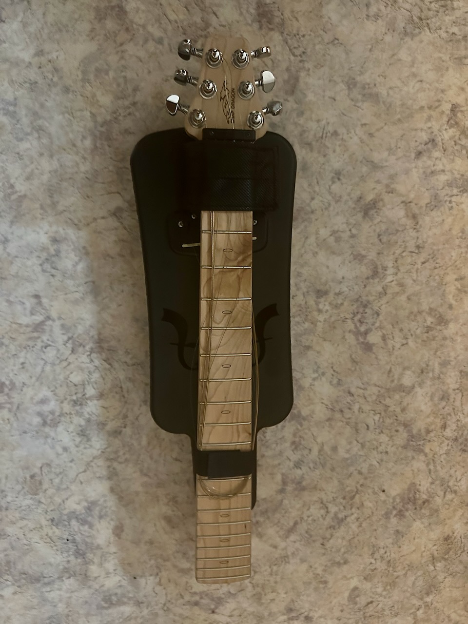 Darum habe ich mir vor einem Jahr eine Gitarre von Snapdragon gekauft. Bei diesem Instrument kann man den Hals umklappen, sie ist dann sehr kompakt. Das Instrument kommt mit Plastikrahmen, welche der Gitarre die richtige Form geben. Diese habe ich nicht mitgenommen, und auch die Befestigungsschrauben entfernt. Ein Schuhbändel funktioniert als Tragriemen. Eine Schneiderin hat mir einen Neoprenbeutel dafür genäht. Jetzt passt die Gitarre bestens in meinen Rucksack. Sie hat sich schon letzten Sommer auf meiner dreimonatigen Radreise bewährt.