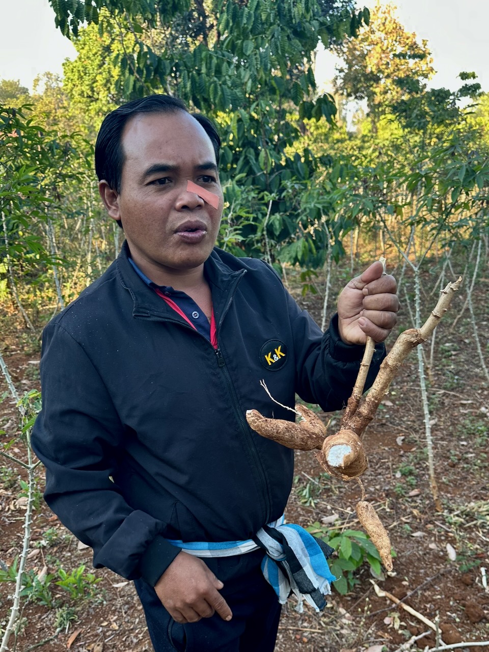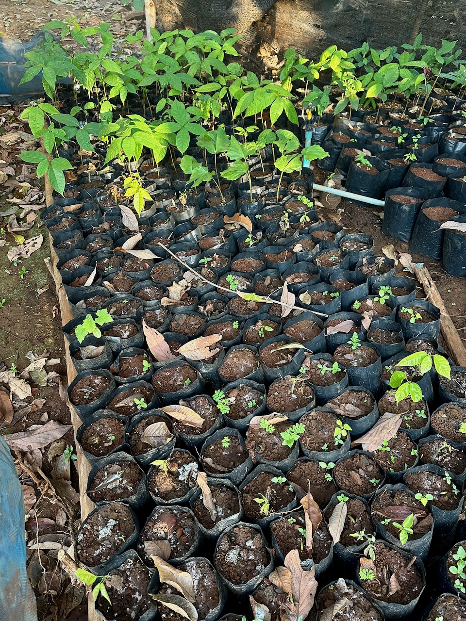 Die Pflanzen werden in kleinen Behältern angesät und später in den Boden gepflanzt, die verschiedenen Kaffee-Sorten brauchen unterschiedliche Abstände der Pflanzen. Er zeigt mir eine Pflanze, die von gelben Ameisen befallen ist. Er zerreibt das Blatt mit den Ameisen, es entsteht ein scharfer Essiggeruch. Die Ameisen kann man essen, sie schmecken nach Zitrone. Ich lerne auch, wie Maniok angebaut und geerntet und getrocknet wird, und dass die Zahlen-Schilder, die ich jetzt so oft an der Strasse gesehen habe, den unteren und oberen Ankaufspreis für Maniok bedeuten.