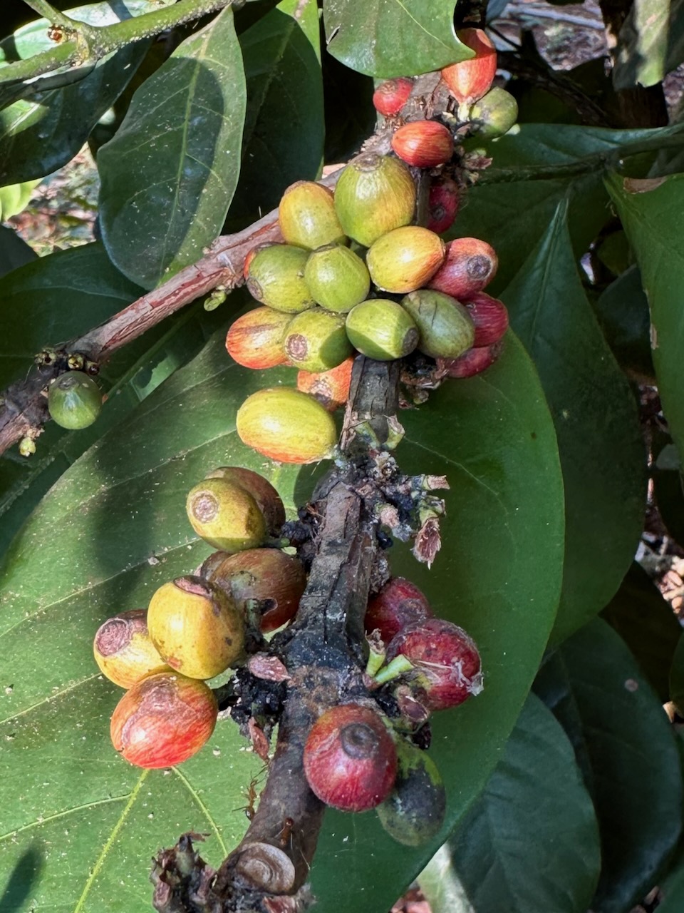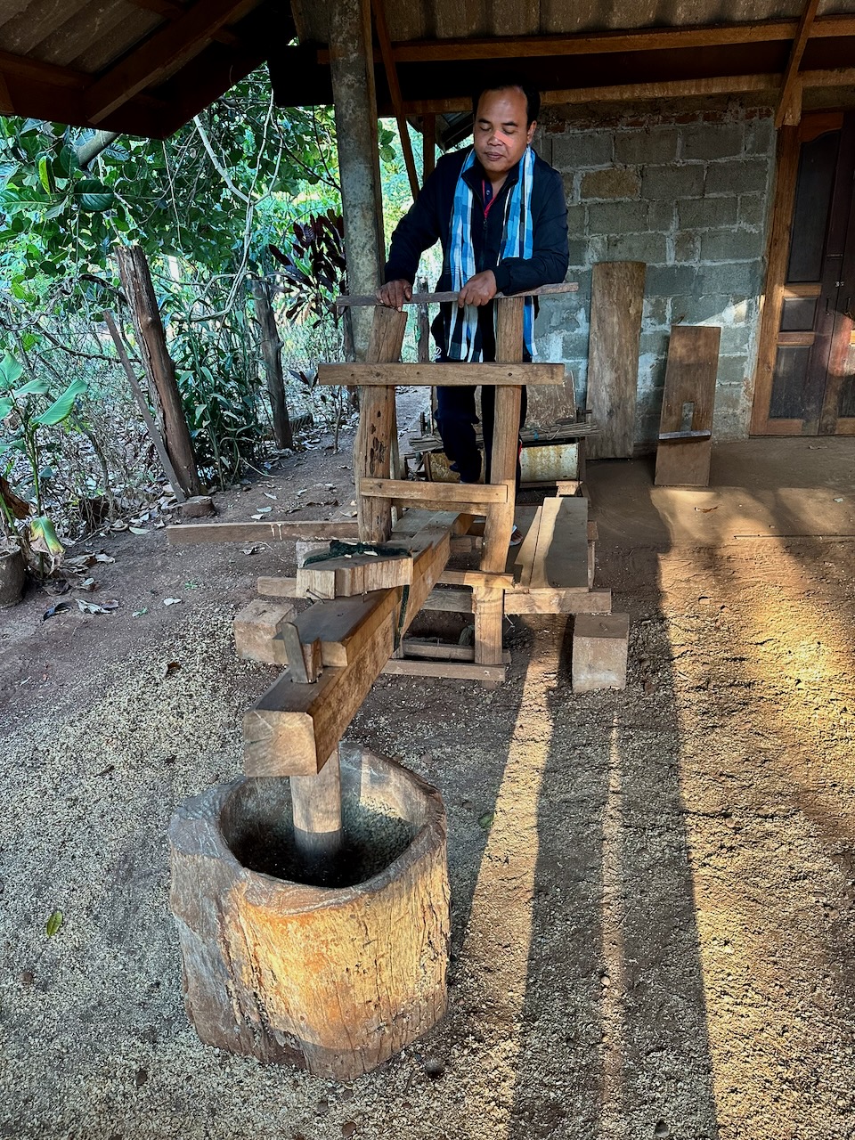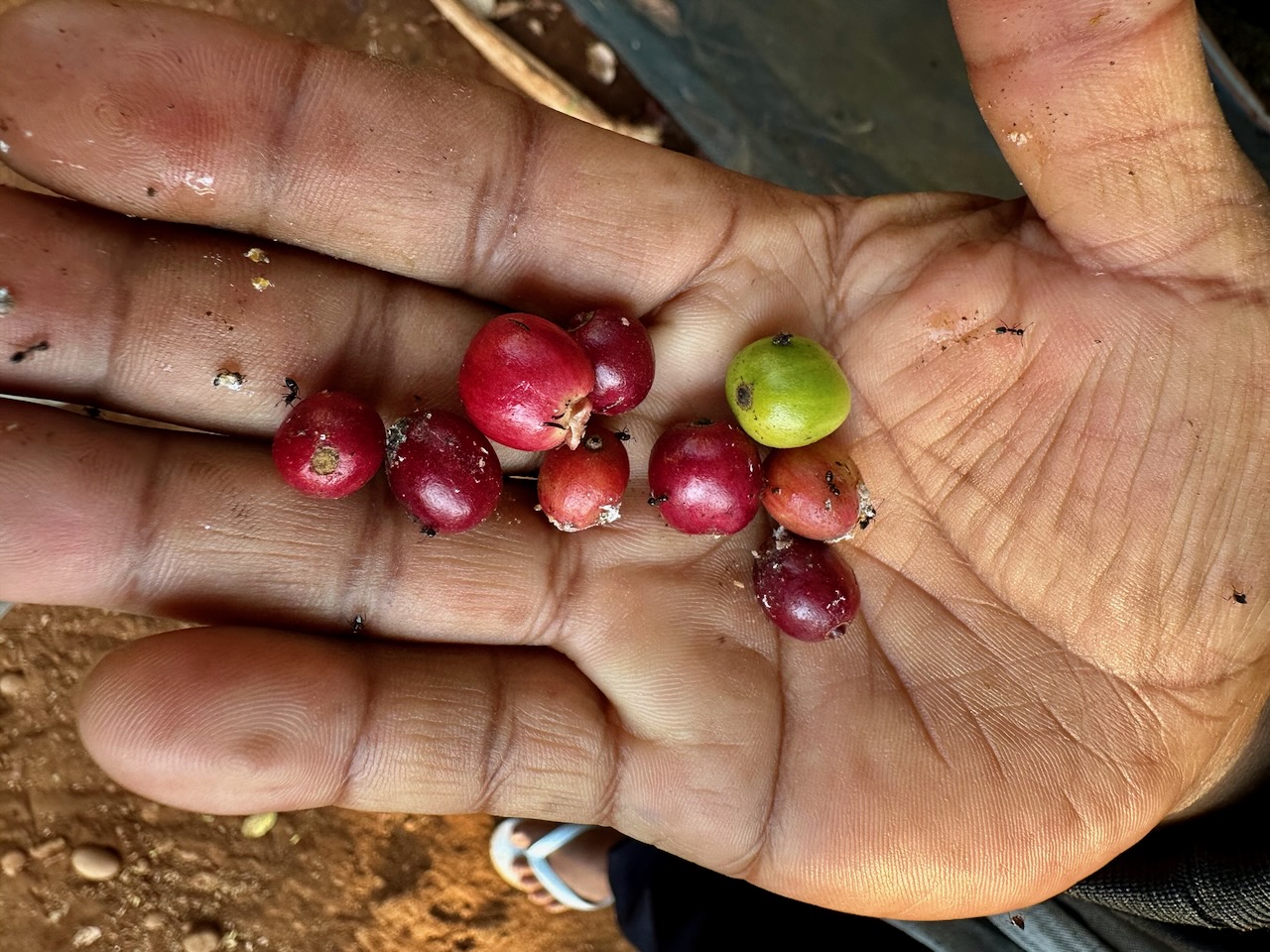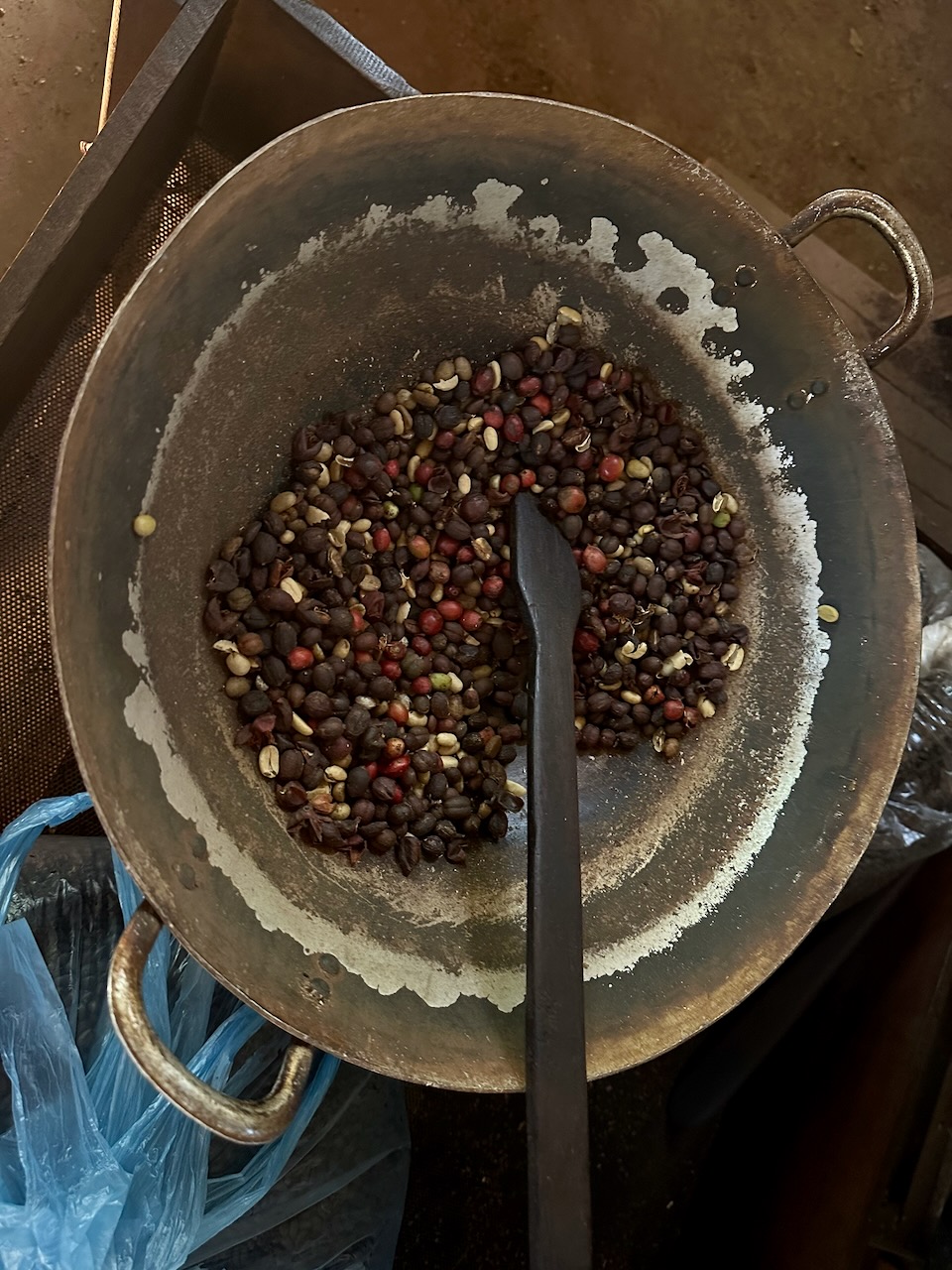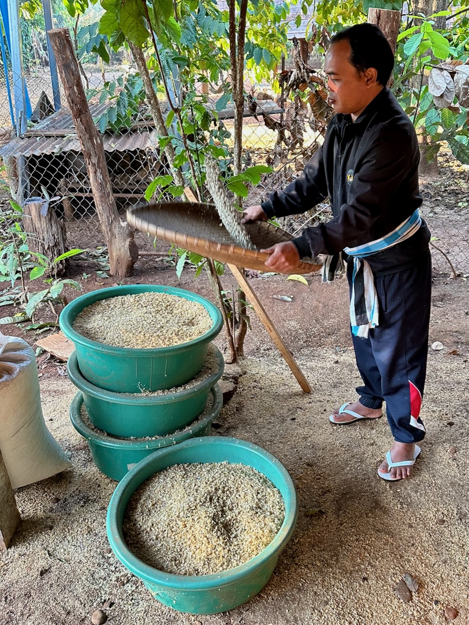 Er erklärt mir, dass er verschiedene Sorten anbaut: Arabica, Robusta, Liberica und Excelsa. Die Sorten gedeihen je nach Höhe über Meer unterschiedlich und sind im Geschmack und Aussehen verschieden. Die Kaffeebohne hat drei Hüllen, die äussere ist rot oder gelb (grün wenn noch nicht reif) und essbar. Je nach Sorte ist sie süsser oder eher bitter. Die zweite Hülle wird ähnlich wie beim Dreschen entfernt. Die dritte fällt beim Rösten aus. Früher hat Mr. Vieng die Bohnen in einer Pfanne geröstet, heute verwendet er eine grössere Röstanlage.