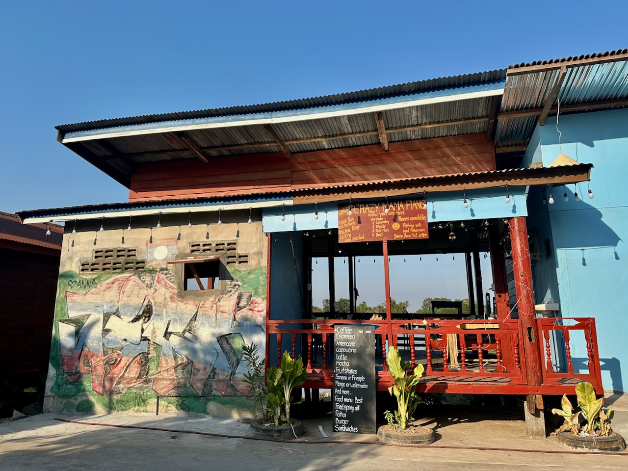 Bald taucht Mr. Tho auf, und ich kann mein einfaches , aber praktisches Zimmer beziehen. Zum Mittagessen bestelle ich den in meinem Reiseführer gepriesenen Pumpkin Burger, der schmeckt ganz gut. Dann spaziere ich Richtung Pier, nehme einen Kaffee im Don Det Café und wandere weiter nach Norden. Überall hat es Restaurants, Tourenanbieter und Guesthouses. Hier dominieren westliche Touristen.