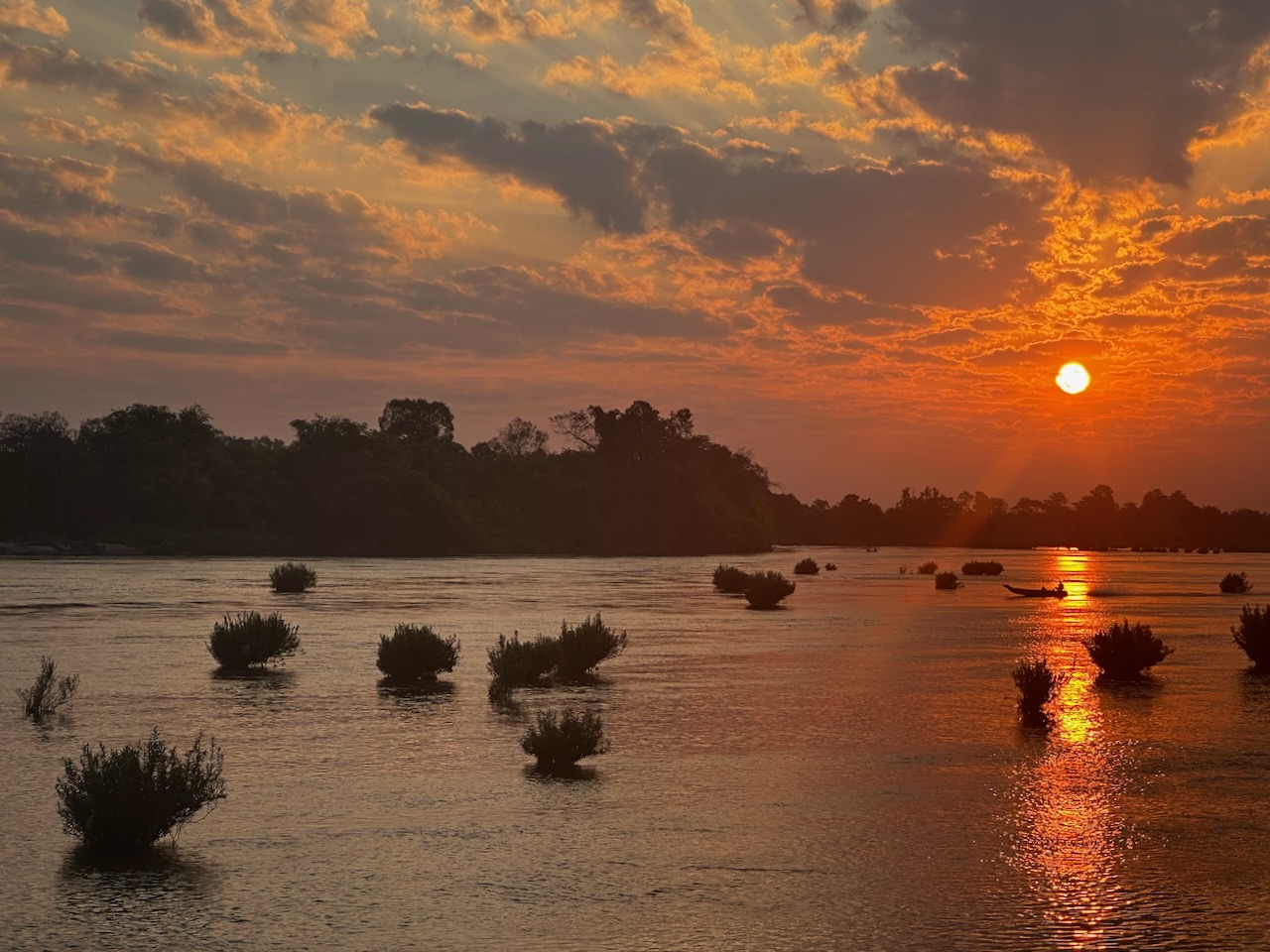 Ich beginne den Tag nochmals mit einer Laufrunde, dann geht’s zum Frühstück. Nun habe ich Zeit, eine Stunde Gitarre zu spielen und zu packen. Um 11 Uhr begleitet mich Mr. Tho zum Bootssteg, wo wir eine halbe Stunde warten, bis uns ein Boot nach Nakasong bringt. Zu Fuss ist es nicht weit vom Pier zum Büro von Green Paradise Tour and Travel. Um 12.15 fahren wir im vollgepackten Bus los. Die Sitze sind durchgesessen, die Federung hatte bessere Zeiten: keine Reise für empfindliche Rücken. Nach 2 ¼ Stunden halten wir in Champasak, jetzt geht es noch eine gute halbe Stunde bis Pakse. Die Strecke zum Hotel bewältige ich wieder zu Fuss und beziehe mein Zimmer.