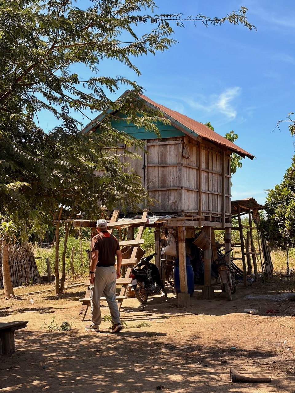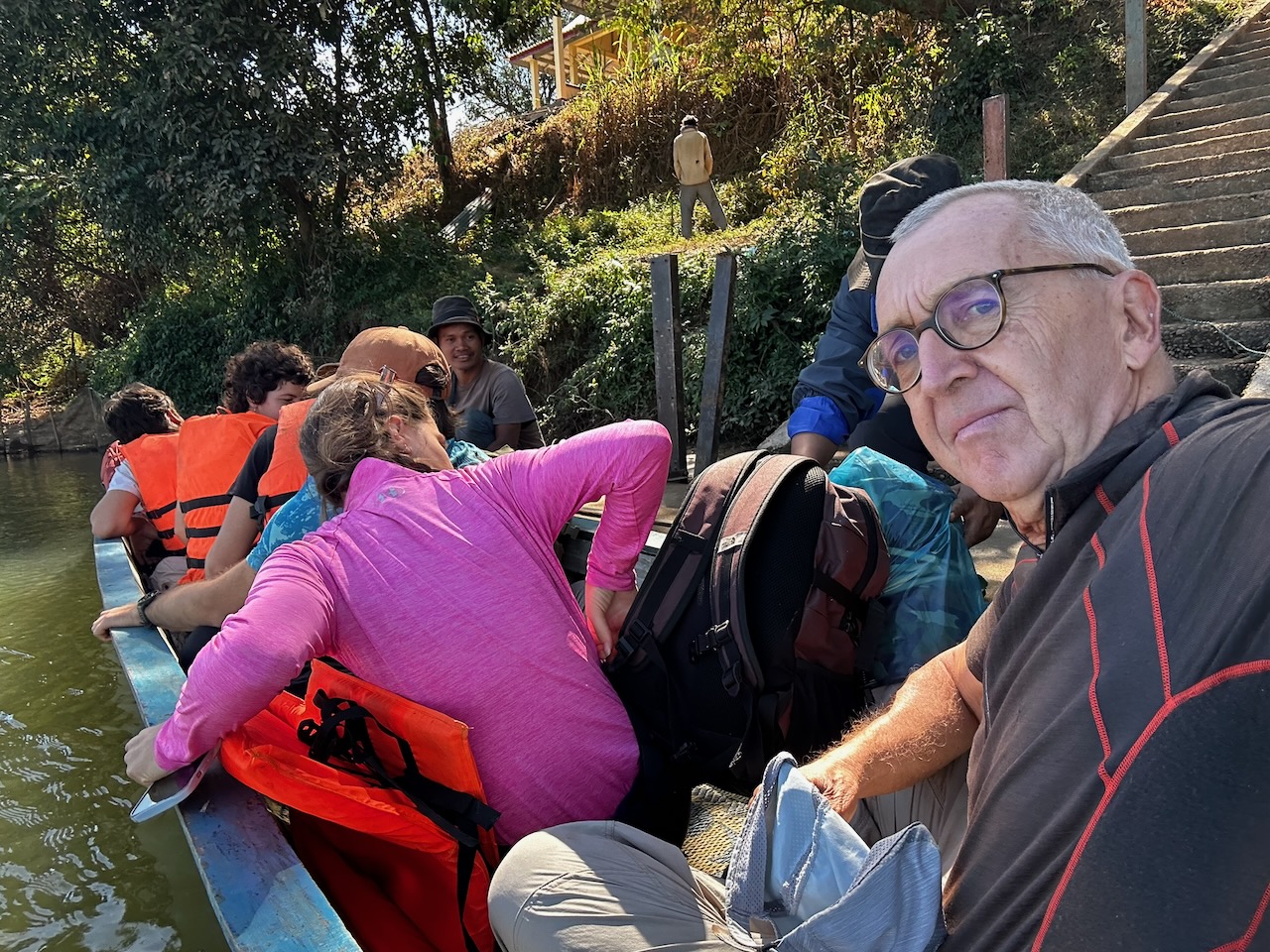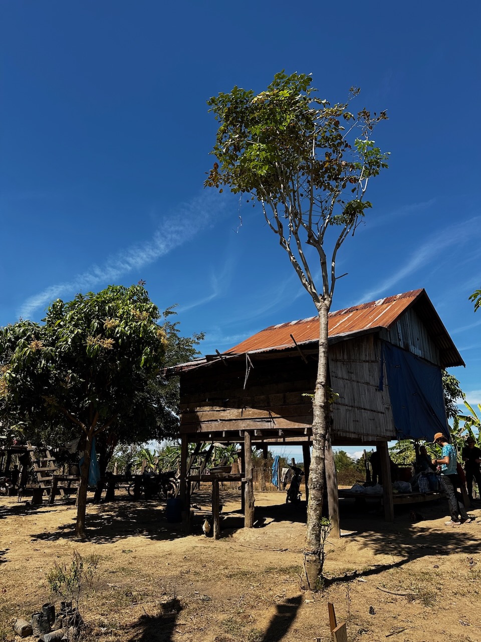 Um 9 fahren wir mit zwei Tuktuks über staubige Strassen in einer Stunde zum Tonle San Fluss. In Veun Sai steigen wir auf ein Boot um und fahren auf dem Fluss 40 Minuten zum Haus unseres Führers Sera, wo zwei weitere Guides zu uns stossen.