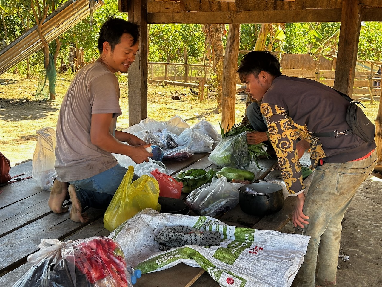 Jetzt geht es zu Fuss weiter, zuerst durch landwirtschaftliches Gebiet mit vielen Cashewbäumen, dann durch den Wald und Bambusdschungel. Bald wird das Mittagessen serviert, diesmal ist es noch ein mitgebrachtes Reisgericht.