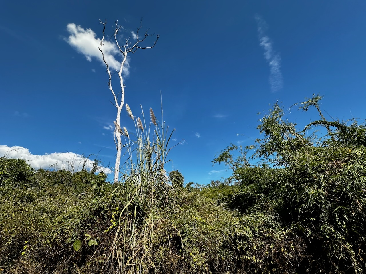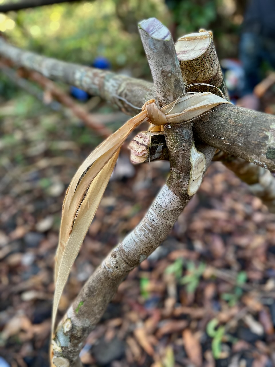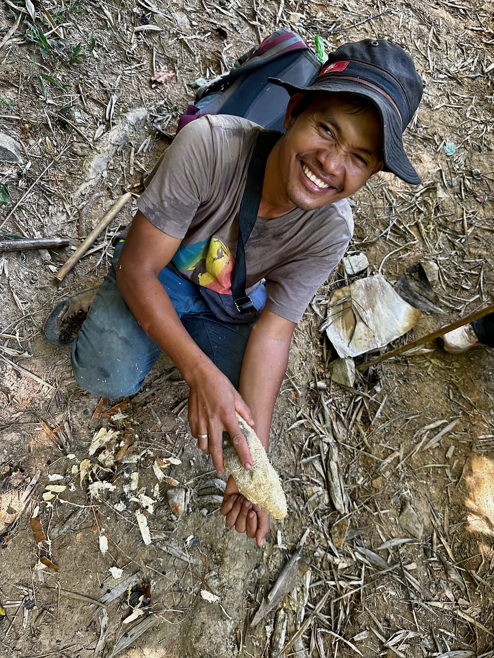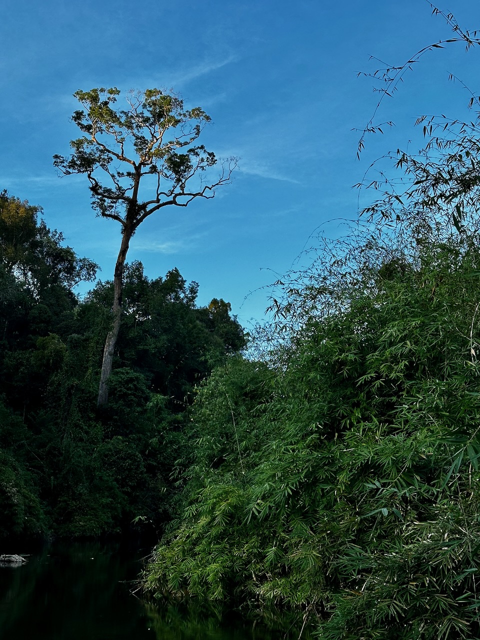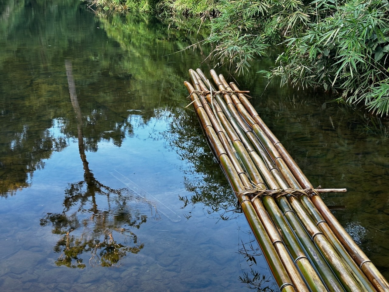 Durch dichten Wald geht es steil auf einen Hügel hinauf und ebenso steil wieder hinunter, bis wir an einen Fluss kommen, wo unser Nachtlager sein wird. Ich bin zuerst etwas enttäuscht, weil alles so dicht bewachsen, überall von Bächen umgeben und schwer zugänglich ist. Aber es findet sich doch noch eine Flussstelle, wo man baden kann und wo auch schon ein Bambusfloss im Fluss schwimmt.