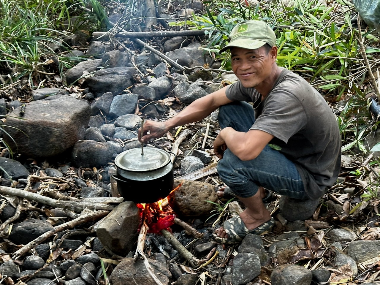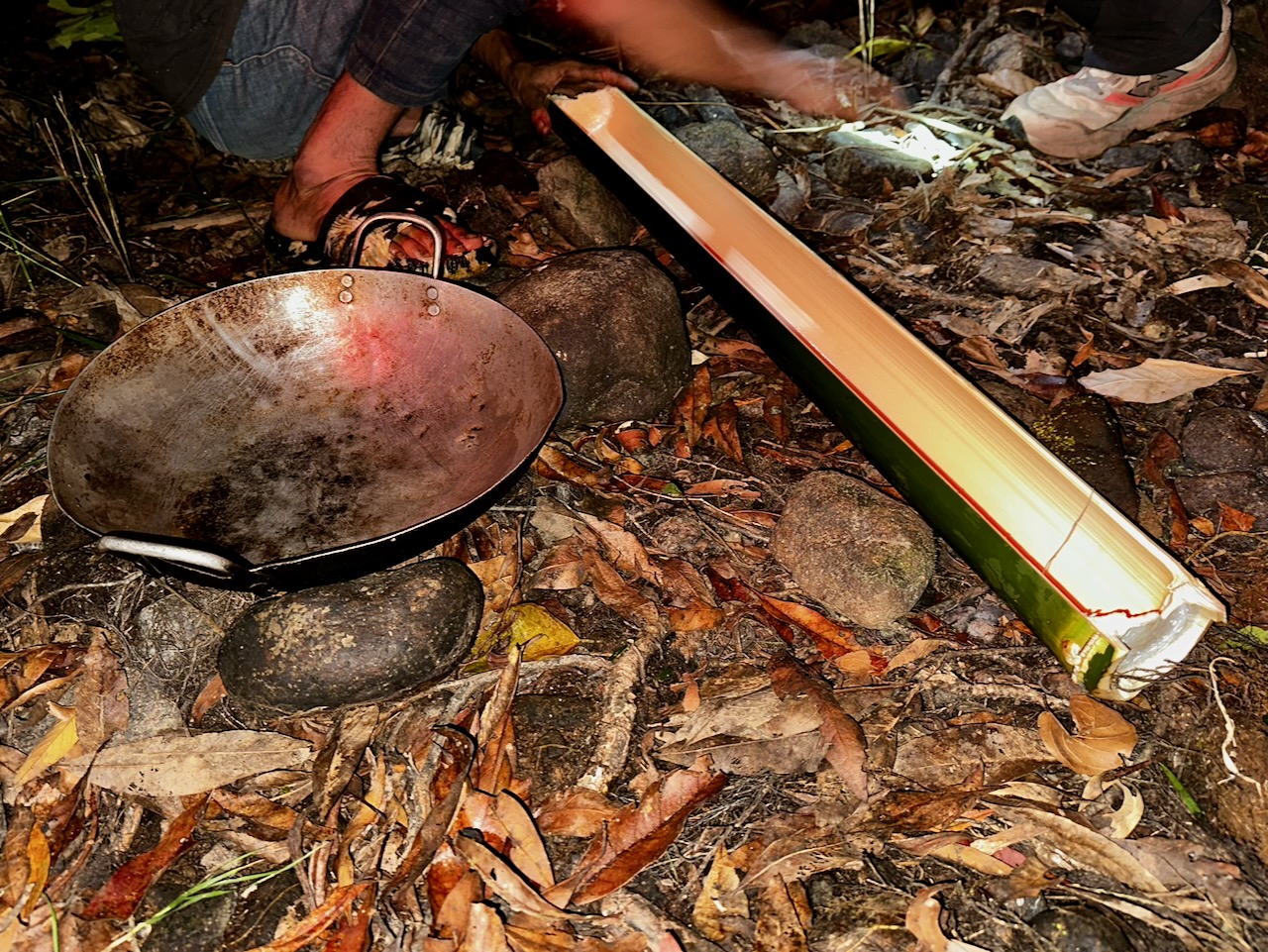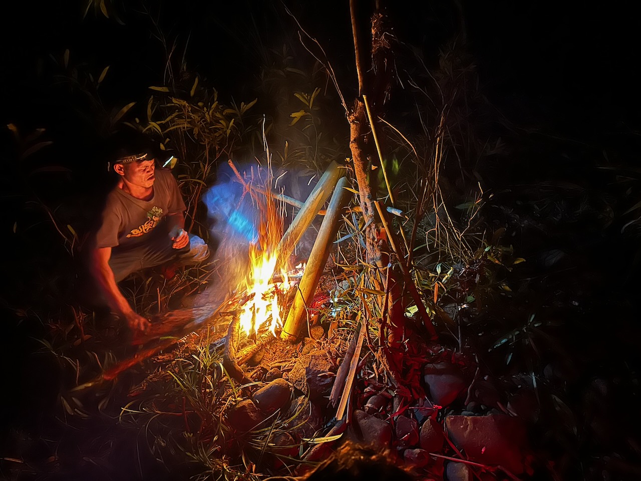 Die Führer bauen ein Gestell für unsere Hängematten, kochen das Abendessen, wobei auch Bambusrohre als Kochgefässe gebraucht werden, wie ich es schon vor zwei Jahren in Luang Namtha kennengelernt habe. Was mit Holz und Bambus und einer Machete hergestellt werden kann, wenn man die Geschicklichkeit und Erfahrung besitzt, ist beeindruckend. Das Essen ist ausgezeichnet.