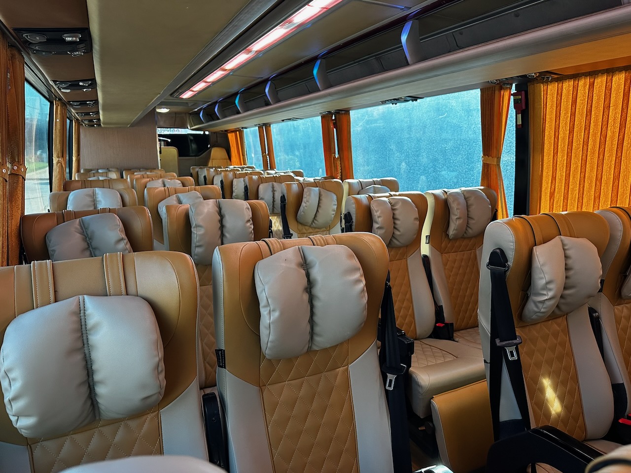 Der Begleiter verteilt Papiersäcke mit einer Rosinenschnecke und einem Saft, dazu gibt es Wasser. Später erhalte ich sogar einen Kaffee. Nicht schlecht für 9$. Immerhin fahren wir 240 km weit. Unterwegs gibt es eine Polizeikontrolle. Ich darf als Einziger aussteigen und meinen Pass zeigen. Aber die Polizisten sind sehr höflich.