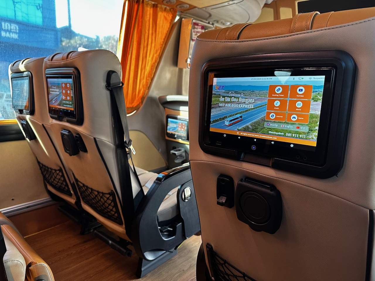 Heute ist die Küche schon früh geöffnet, damit ich um 7 Uhr mein Frühstück bekomme. Um halb acht bringt mich Pu Thea zur Busstation von Vireak Buntham Express. Er hat für mich schon eine Fahrkarte gekauft, die kostet 9 $. Der Bus ist gross und modern, eingerichtet wie im Flugzeug mit Bildschirmen vor jedem Sitz. Es gibt sogar eine Filmauswahl. Um 8.15 fahren wir los, das Thema Flugzeug wird durchgezogen: der Chauffeur trägt eine Pilotenuniform und der Begleiter macht eine Ansage auf Khmer und auf Englisch, genau wie beim Abflug. Allerdings ist im PA System der Hall aufs Maximum aufgedreht, das war schon in der Busstation der Fall. So versteht man kein Wort. Der Bus ist nur spärlich besetzt.