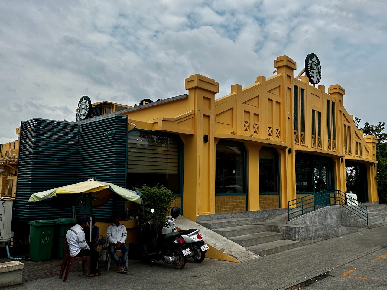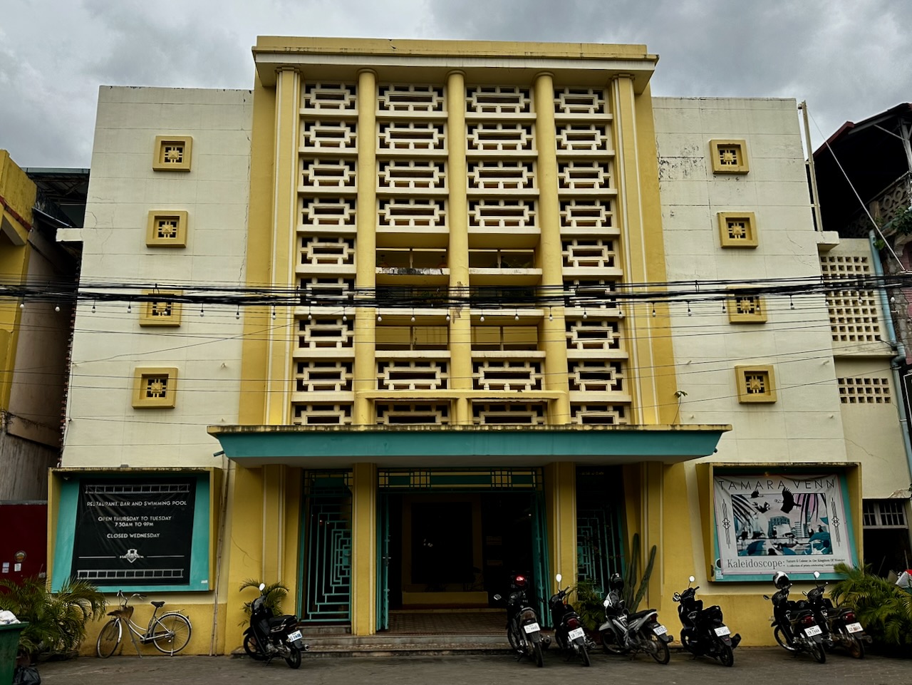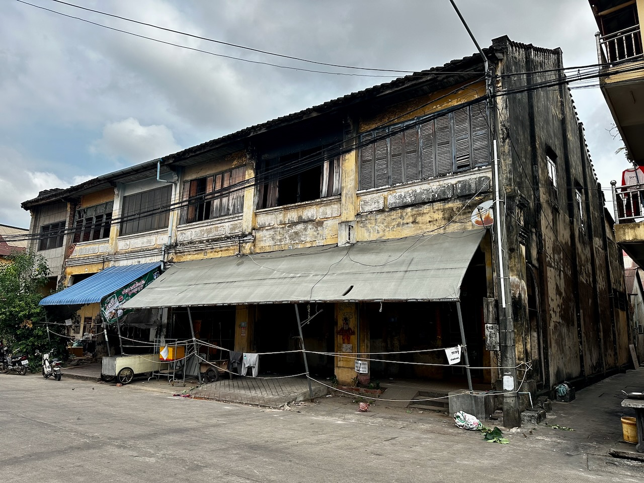 Das ehemalige Theater ist nur noch eine verwitterte Fassade, das Alte Kino ist wieder falsch auf dem Plan eingetragen, ich finde es dennoch. das Gebäude ist jetzt ein Hotel. Ich komme zum Fluss, wo im Fischmarktgebäude der Starbucks haust. 100 m weiter östlich war früher die Markthalle, das Gebäude ist noch erkennbar, aber von allen Seiten von Läden umstellt. In der früheren Residenz des französischen Militärkommandanten befindet sich das Rote Kreuz. Das palastähnliche gelbe Haus beherbergt das Provinz–Museum, welches für unbestimmte Zeit geschlossen ist. Dahinter geht es zum Lotus–Teich, zur Polizei–Station und zur Chinesischen Schule.