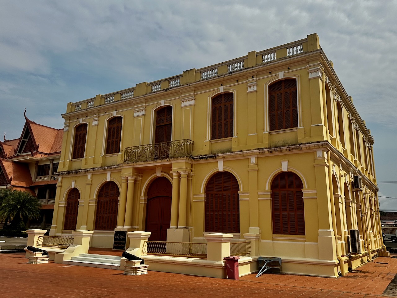 Im Touristenbüro habe ich eine Broschüre mitgenommen, in welcher eine Tour durch Kampot beschrieben wird. Die trägt den Titel: Architecture of Kampot. Diese Tour will ich heute machen. Das erste Objekt auf meiner Route ist eine gelbe Villa, die einem gewissen Dr. Dauban gehört haben soll. Über diesen Herrn ist leider nichts Weiteres zu erfahren. Heute befindet sich darin das Tourismus Departement. Auch im nächsten Gebäude hat sich ein amtliches Büro eingenistet, diesmal ist es das Informations–Departement, welches das rötliche Gebäude bewohnt. Die Bäckerei, welche seit 1940 immer noch in Betrieb sein soll, ist etwas schwieriger zu finden, weil sie auf der Karte ungenau eingetragen ist. Beim Suchen lerne ich einen Café-Besitzer kennen, I., ein Kroate, aber jetzt Schweizer aus Bonstetten, welcher seit 4 Jahren in Kampot lebt. Seine junge Angestellte büffelt Gesetzesbücher, wenn sie nicht serviert, sie studiert nämlich Jus. Ich bleibe für einen Kaffee und ein Croissant.