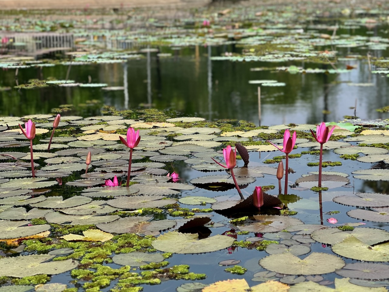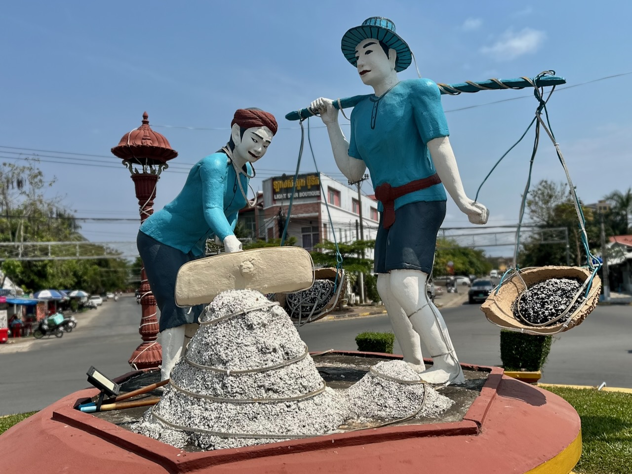 Mit dem Tuktuk fahren wir los, wir sind nur zwei Teilnehmer. Der Hügel liegt leider im Nebel, und ab und zu regnet es auch. Vom Aussichtspunkt hat man einen Blick auf die Stadt, die Salzfelder, den Fluss und die Ebene bis zum Meer. Heute ist die Sicht nicht sehr klar. Kampot hat drei Haupterwerbszweige: Durian, Salz und Pfeffer.