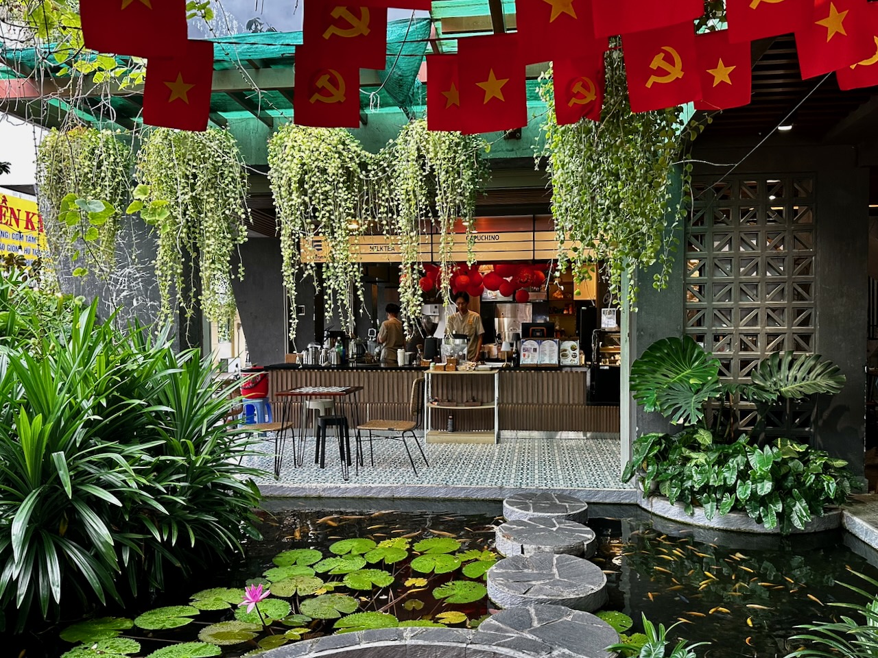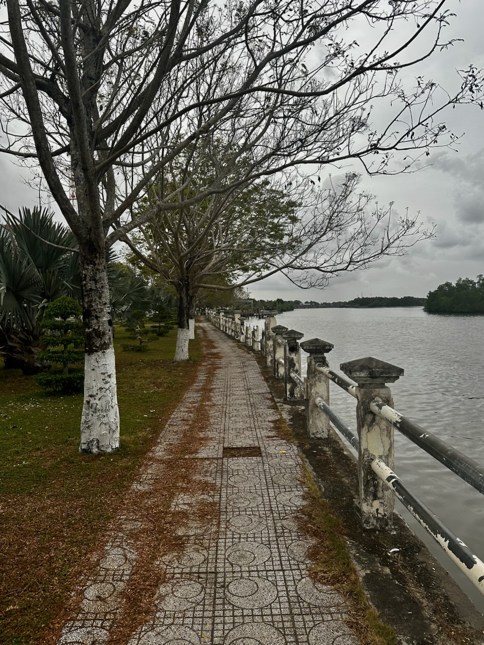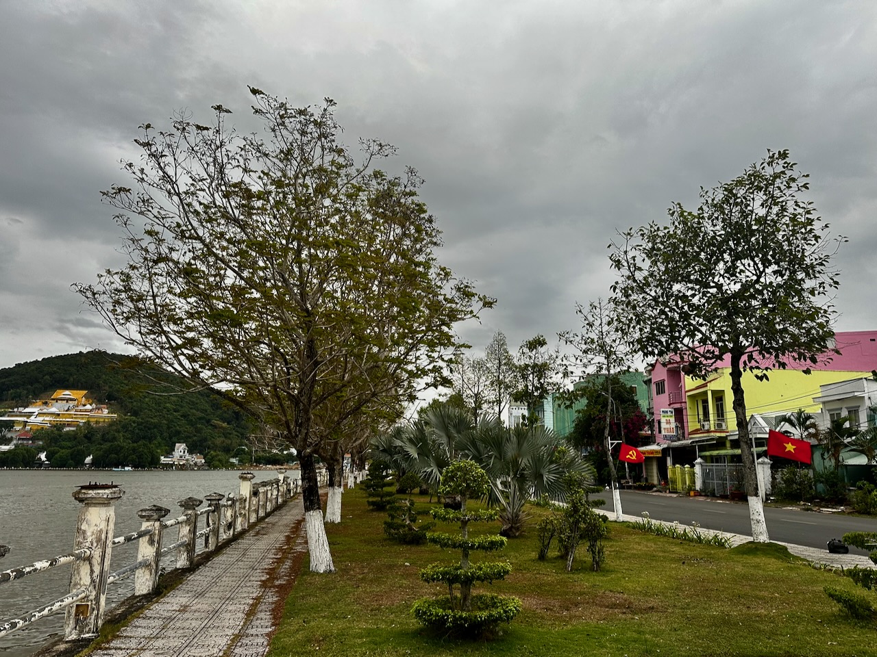 Hier bin ich schon in der Bucht von Hà Tiên, das Meer ist eine schmutzige Brühe. Ich drehe um und setze meinen Weg flussaufwärts fort, wieder vorbei am Markt und dem Ufer entlang. Hier wurde mal ein kleiner Park angelegt. Leider ist der Fussweg nicht durchgehend. Über eine Brücke gelange ich zum Hafen. Hier ist wieder überall der angeschwemmte Plastikmüll zu sehen.