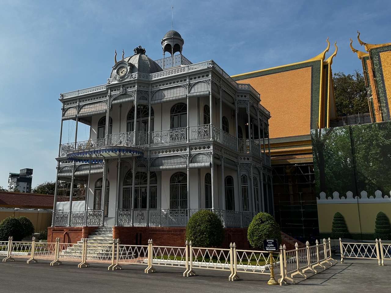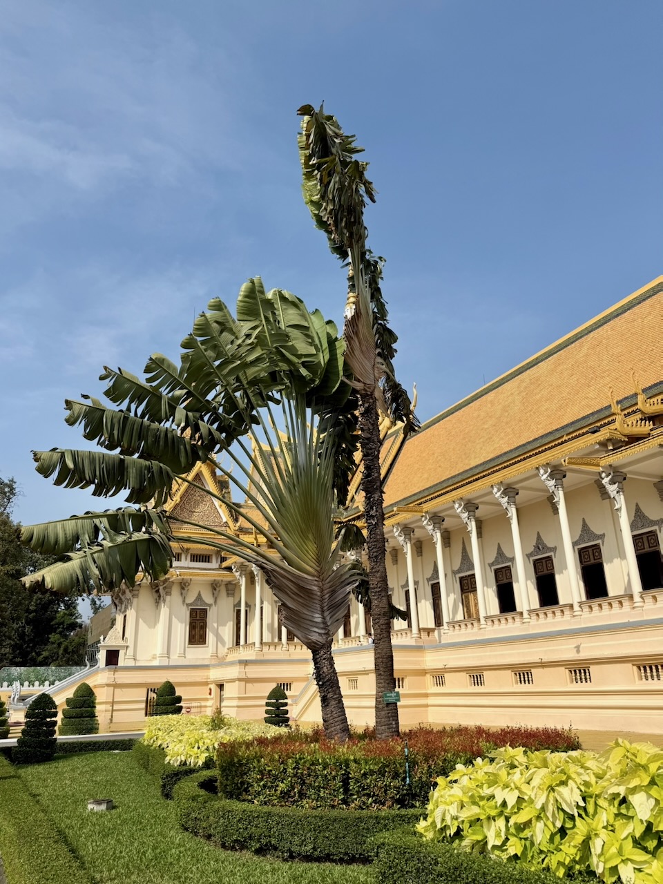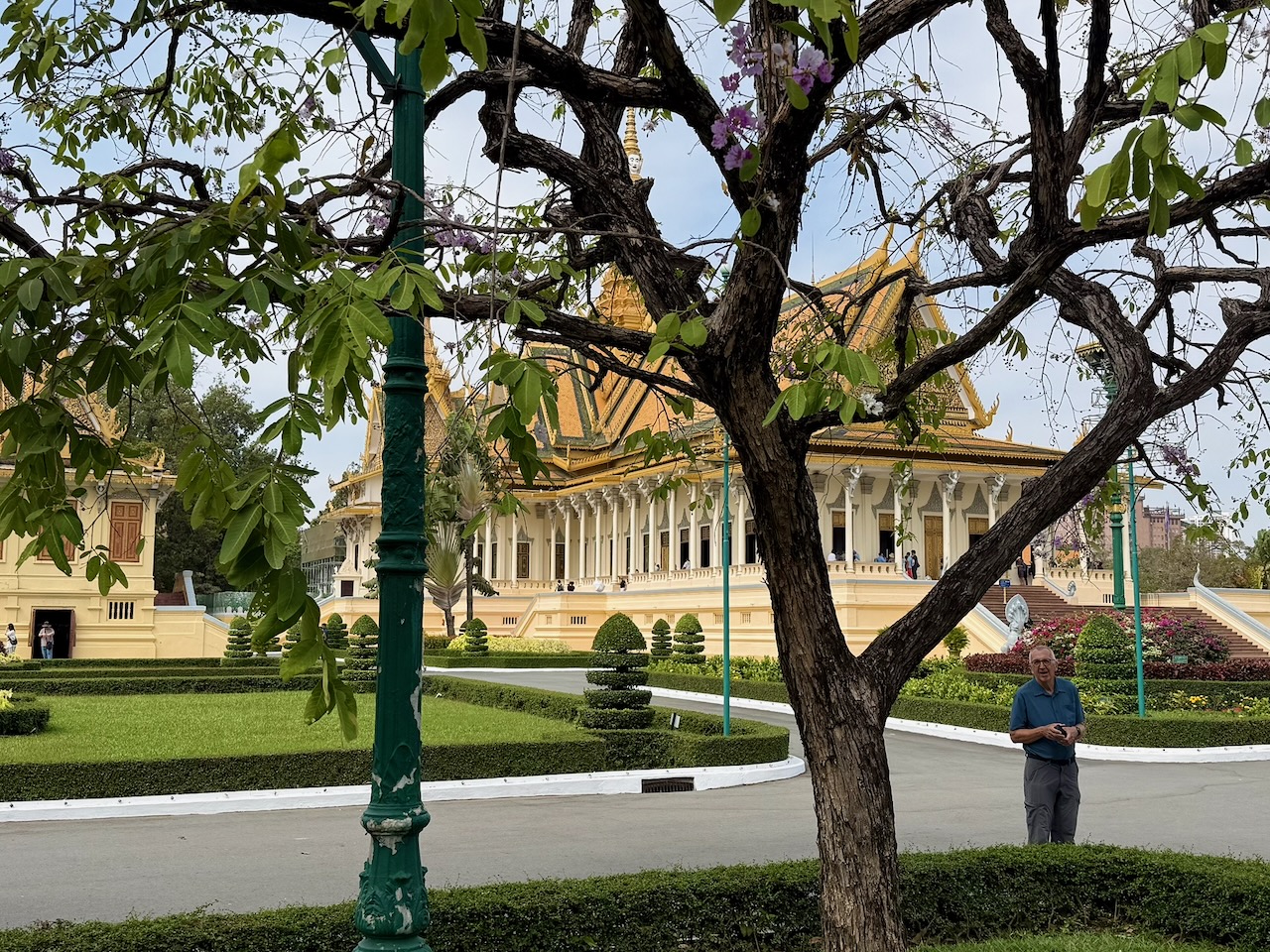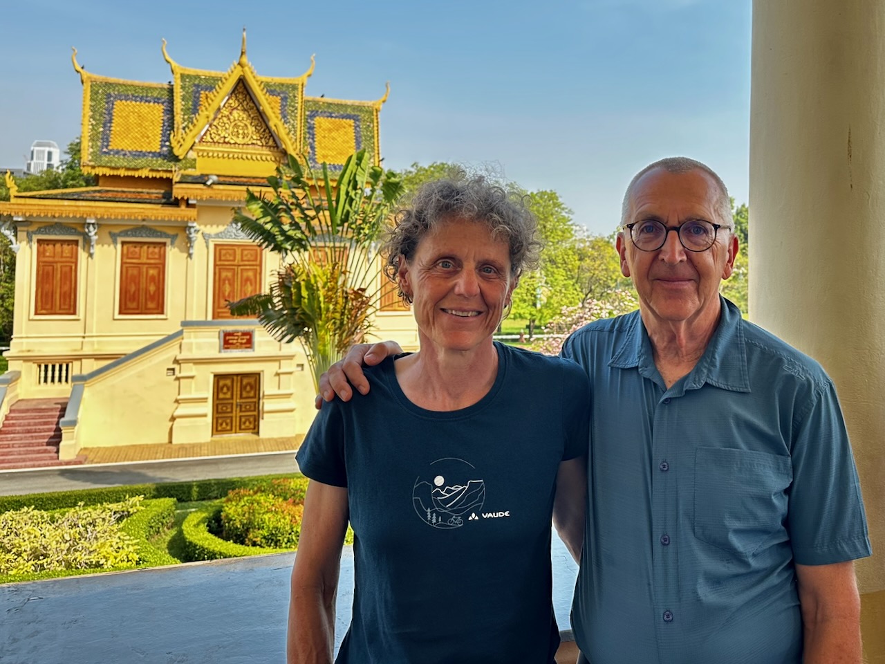 Wir frühstücken im Café Bora. Nun besuchen wir den Königspalast. Der Eintritt beträgt 10$ pro Person, für weitere 10$ leisten wir uns einen Führer. Er erklärt uns, welche Teile noch heute vom König bewohnt werden und welche Teile öffentlich sind. Wir beginnen mit dem Thronsaal, sehen die Kronjuwelen, kommen am Napoleon Pavillon vorbei, schauen in den Tempel mit Emerald Buddha hinein, betrachten die Fresken in der Umfassungsmauer und besuchen die Silberpagode. Verschiedene Galerien zeigen Buddhas, Elefanten und Bilder.
