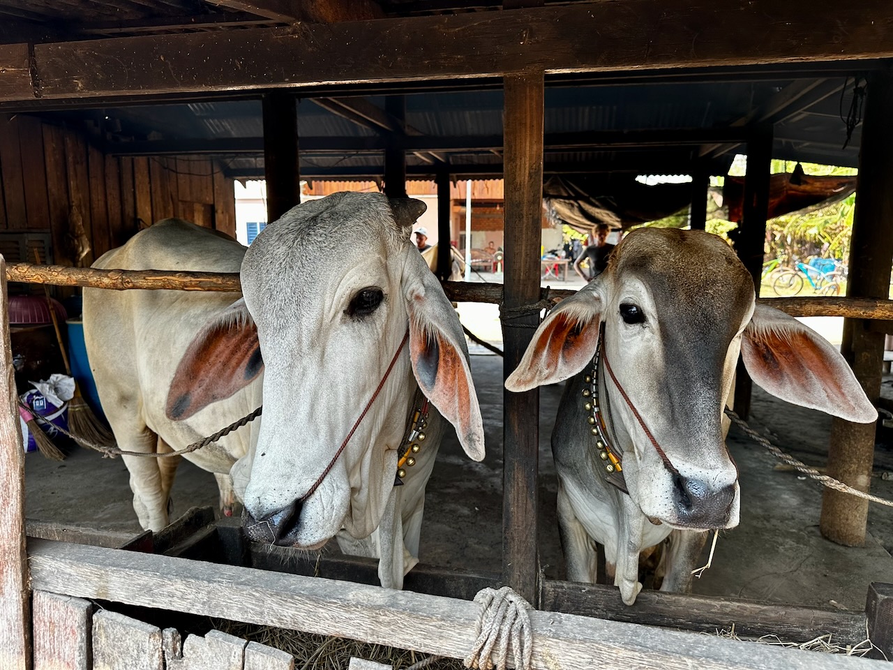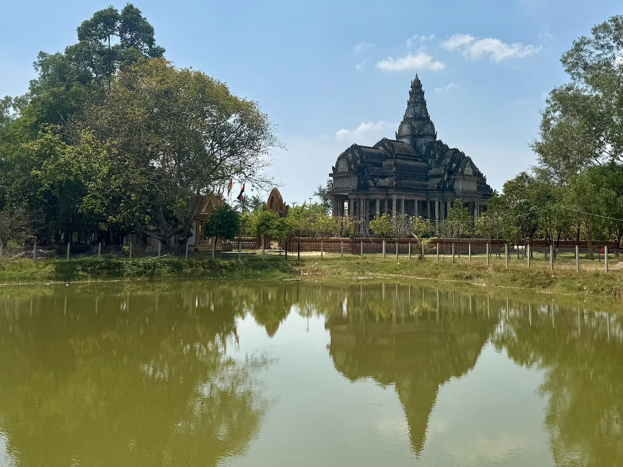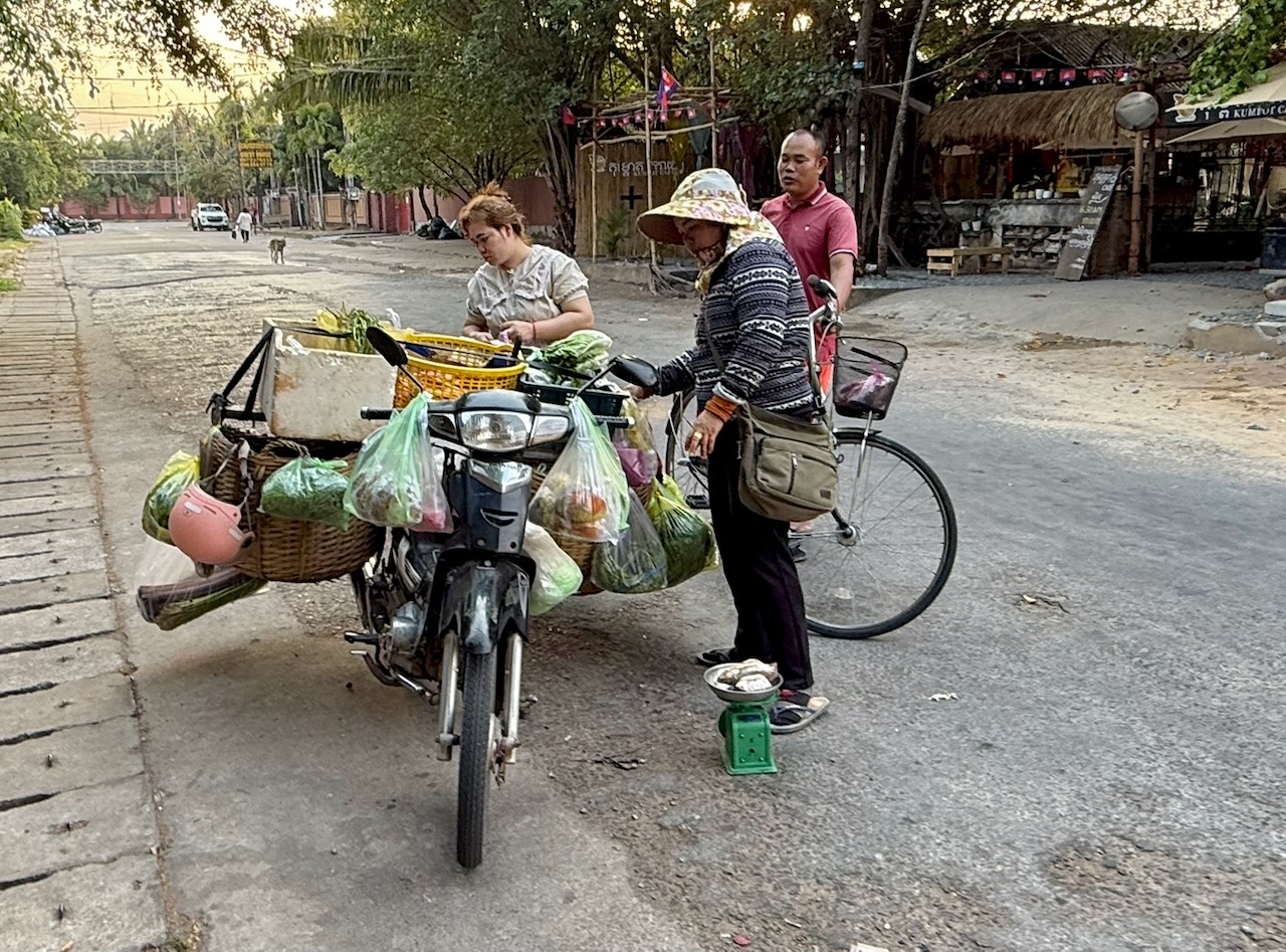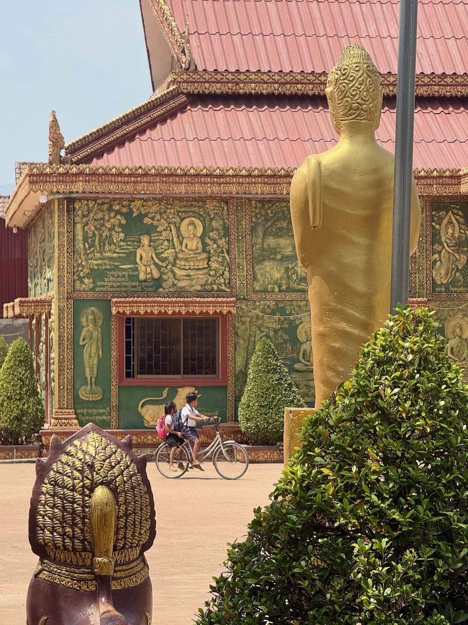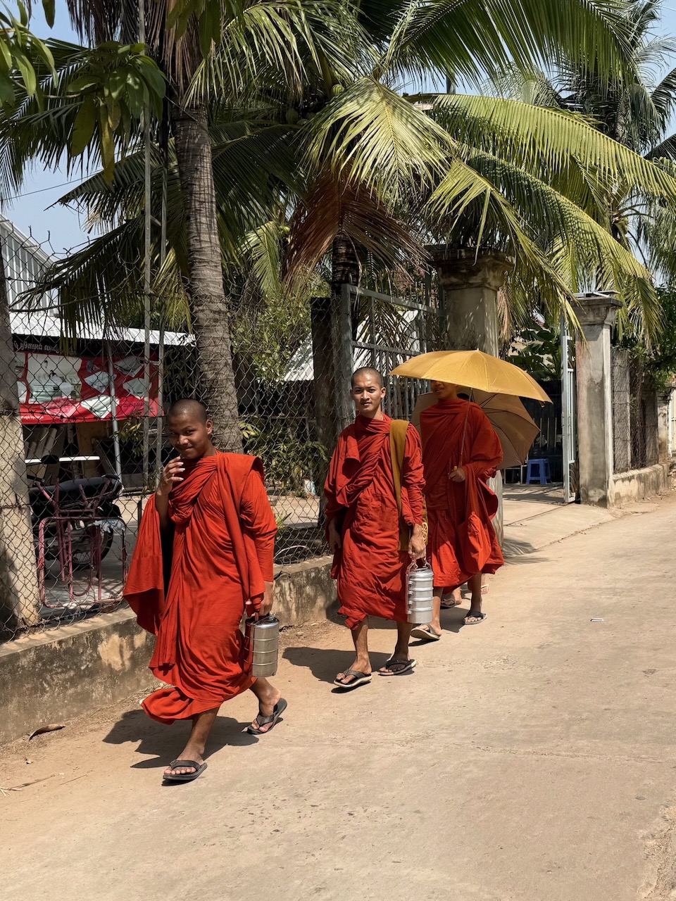 Wir holen unsere Mountainbikes bei Pheara Visa, Travel & Tour ab. Nach einem kurzen Halt beim Lotus Pond, wo uns Jason aus der Mythologie berichtet, sind wir schnell aus der Stadt raus und folgen schmalen Nebenstrassen. Jason zeigt uns sein Haus, er bezahlt 150 $ Miete pro Monat.  An einem Strassenstand gibt es zu trinken, das schätzt man, denn es ist schon sehr warm. Wir wählen Zuckerrohr-Saft. Tempelbesuch, verschiedene Lehren des Buddhismus und Verbindung zum Geisterglauben. Noch ein Tempel mit Schule, dann gibt es ein köstliches authentisches Mittagessen bei einer Khmer Familie.