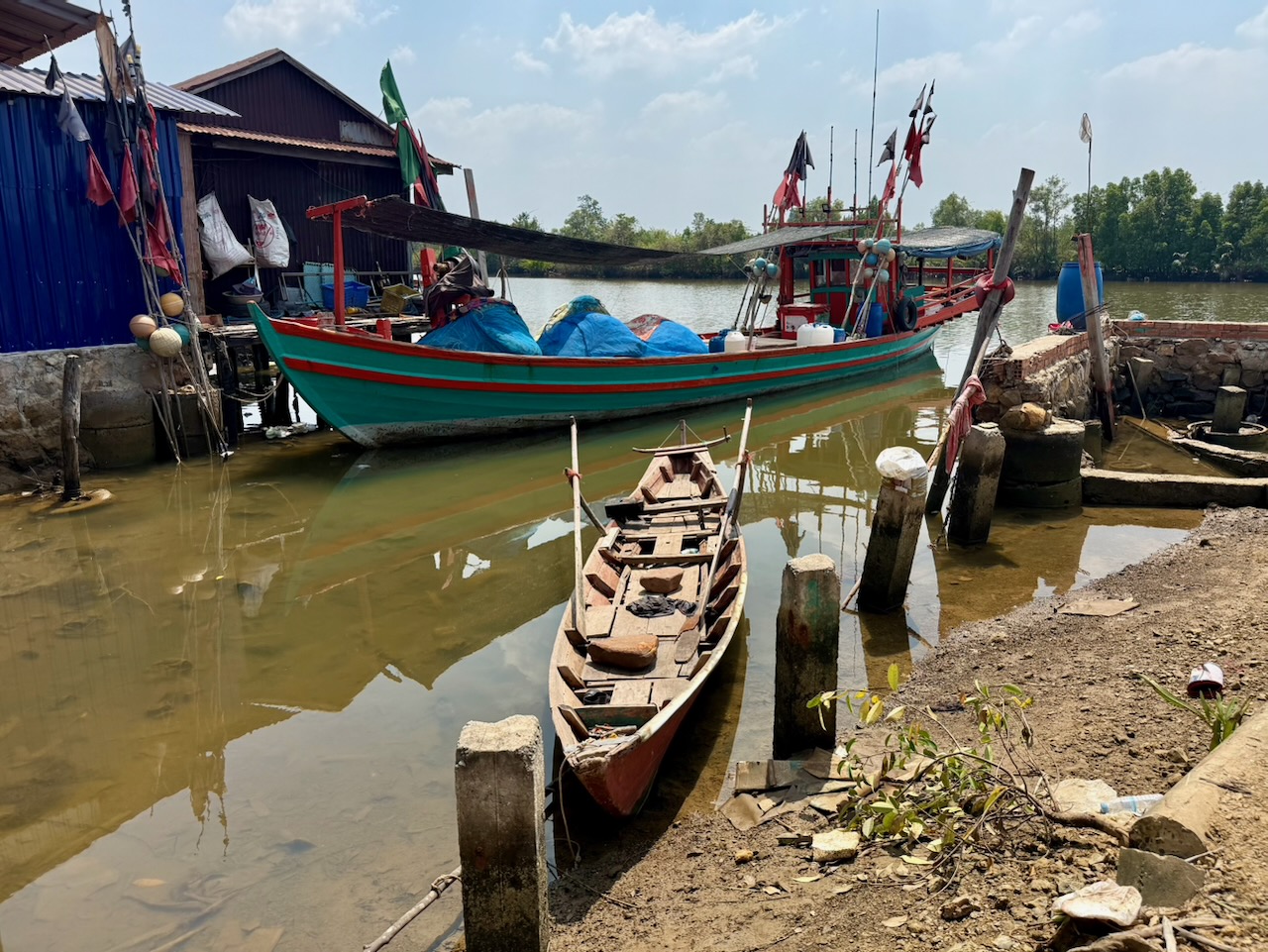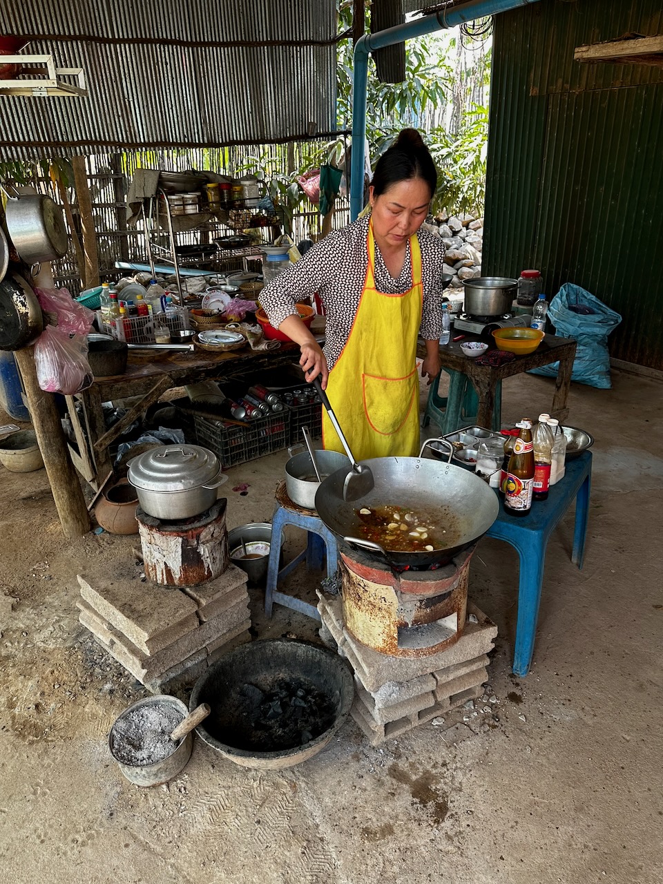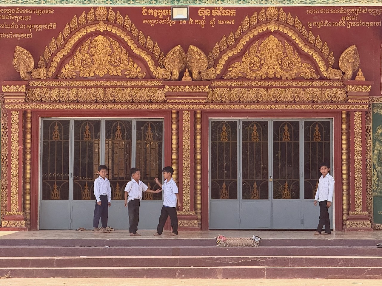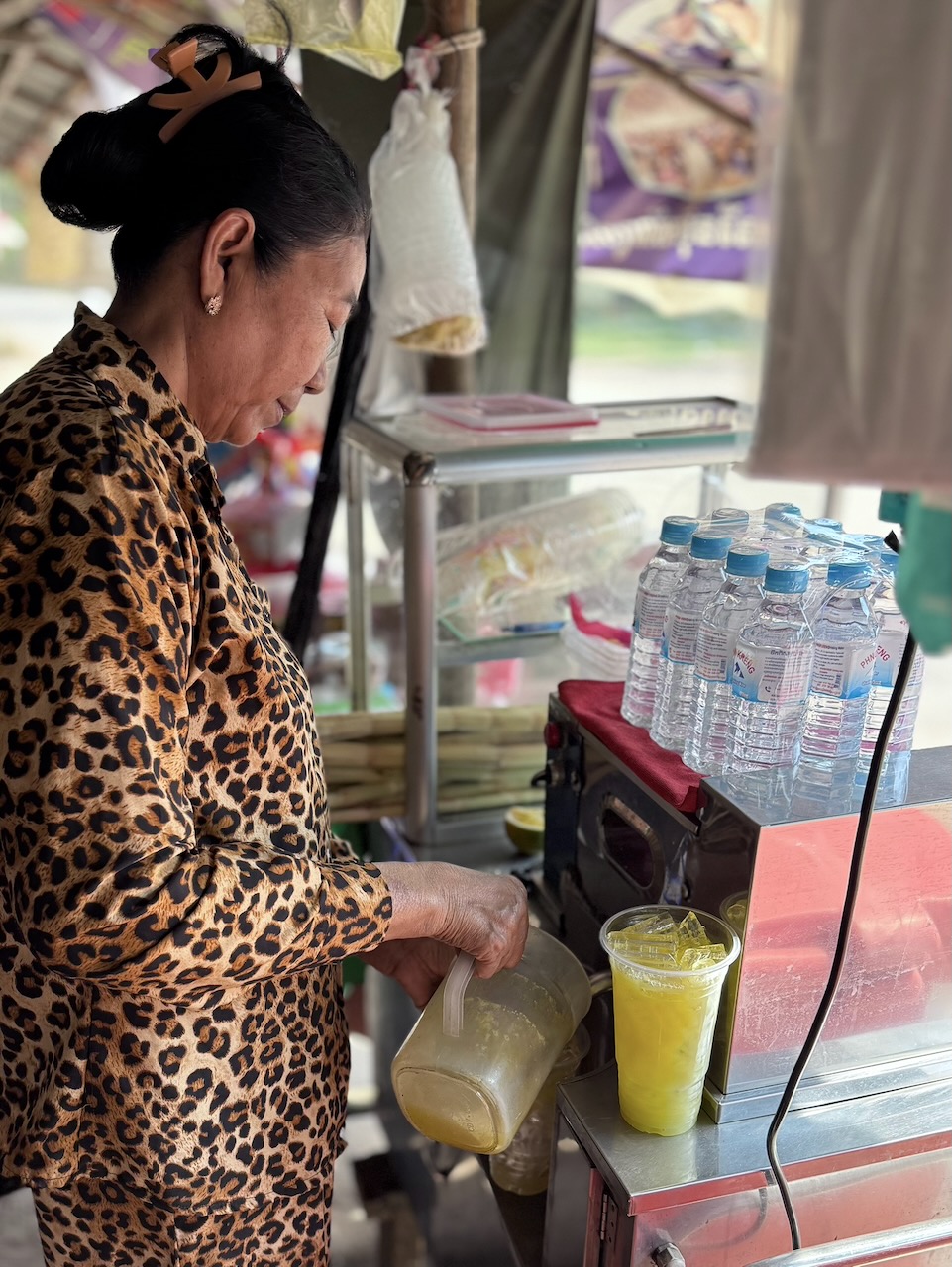 Wir holen unsere Mountainbikes bei Pheara Visa, Travel & Tour ab. Nach einem kurzen Halt beim Lotus Pond, wo uns Jason aus der Mythologie berichtet, sind wir schnell aus der Stadt raus und folgen schmalen Nebenstrassen. Jason zeigt uns sein Haus, er bezahlt 150 $ Miete pro Monat.  An einem Strassenstand gibt es zu trinken, das schätzt man, denn es ist schon sehr warm. Wir wählen Zuckerrohr-Saft. Tempelbesuch, verschiedene Lehren des Buddhismus und Verbindung zum Geisterglauben. Noch ein Tempel mit Schule, dann gibt es ein köstliches authentisches Mittagessen bei einer Khmer Familie.