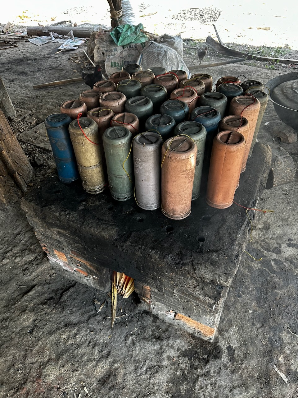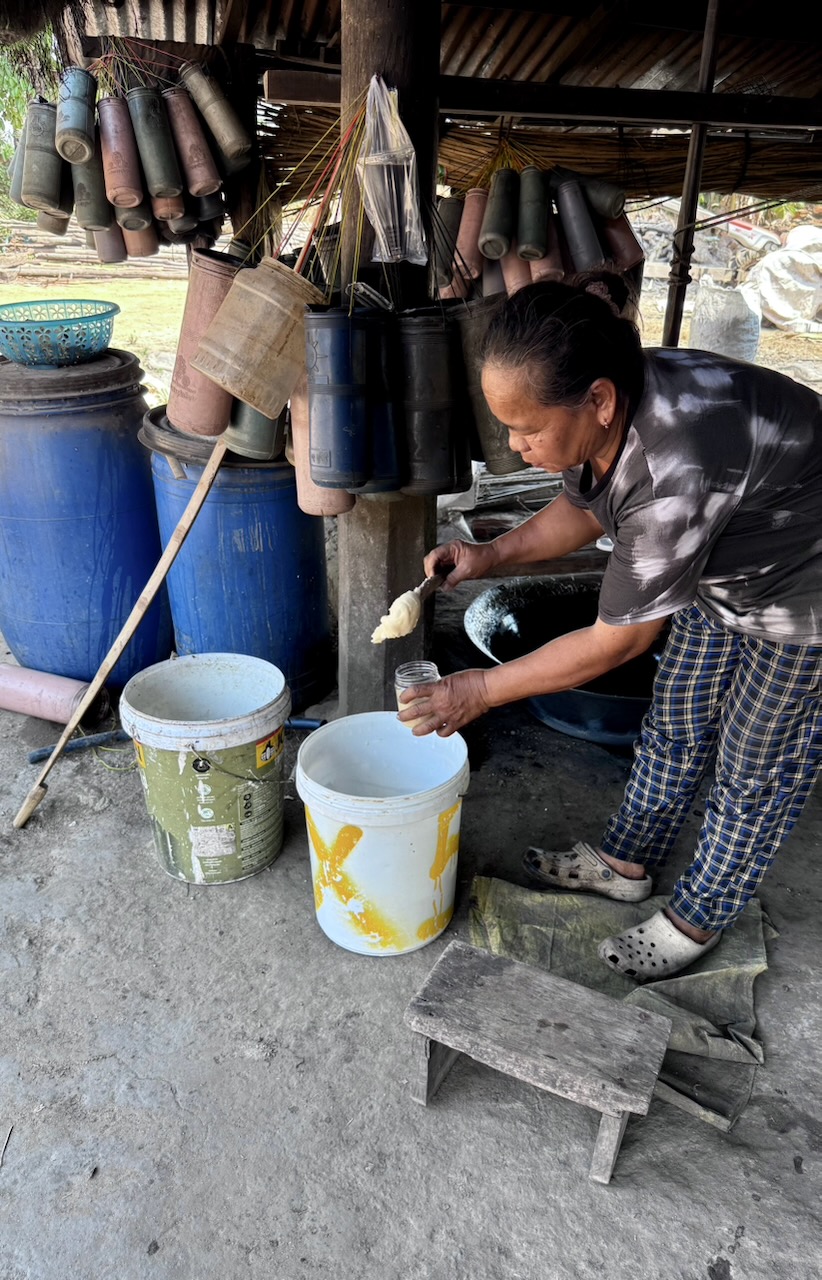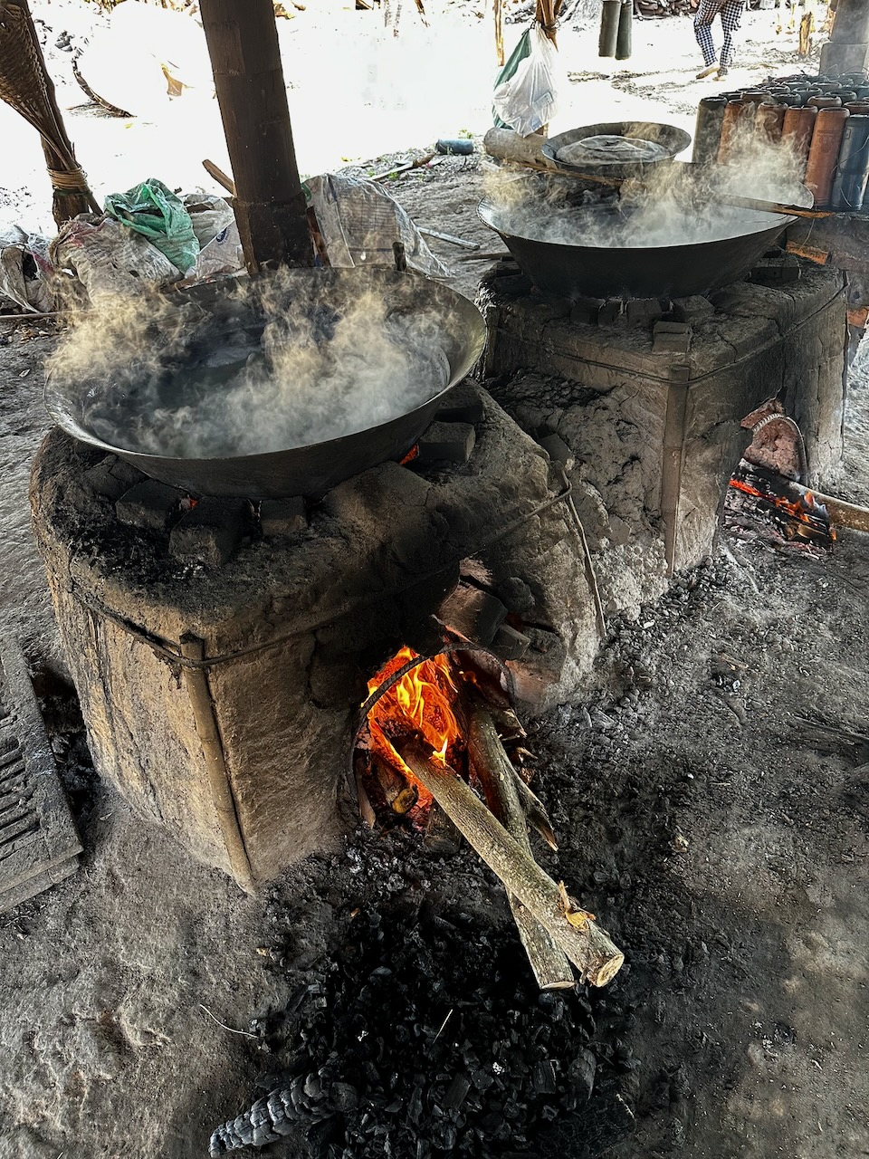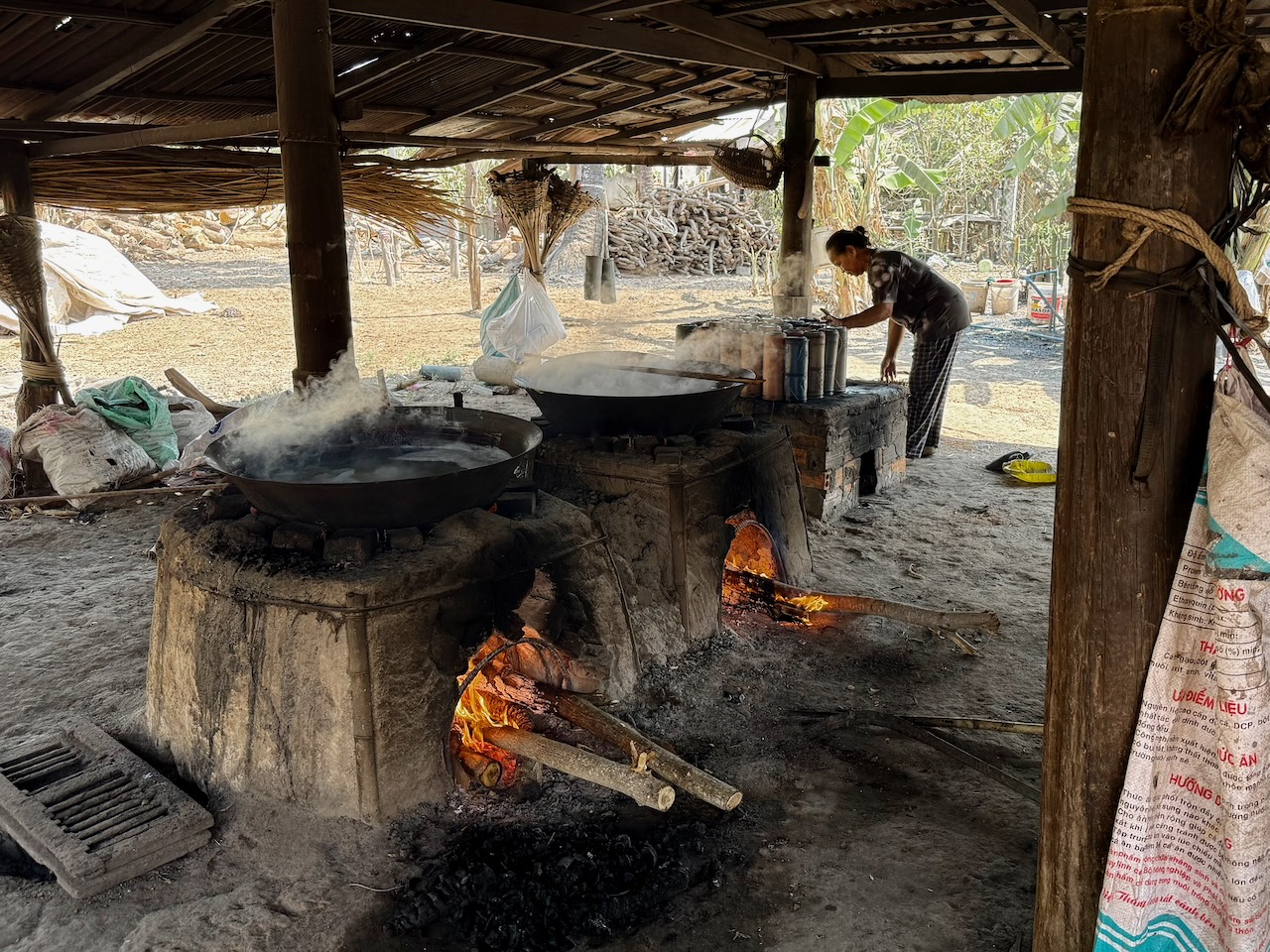 Wir fahren zu einer anderen Familie, welche seit vielen Jahren Palmzucker herstellt. Der Saft der Palmen wird in Behältern gesammelt, dazu muss man auf den Baum klettern. Dann wird der Saft eingekocht und abgefüllt. Der Ablauf ist zeitlich genau bestimmt. Eine Riesenarbeit, die sich täglich wiederholt und nicht sehr viel Geld einbringt. Um 16 Uhr sind wir zurück.