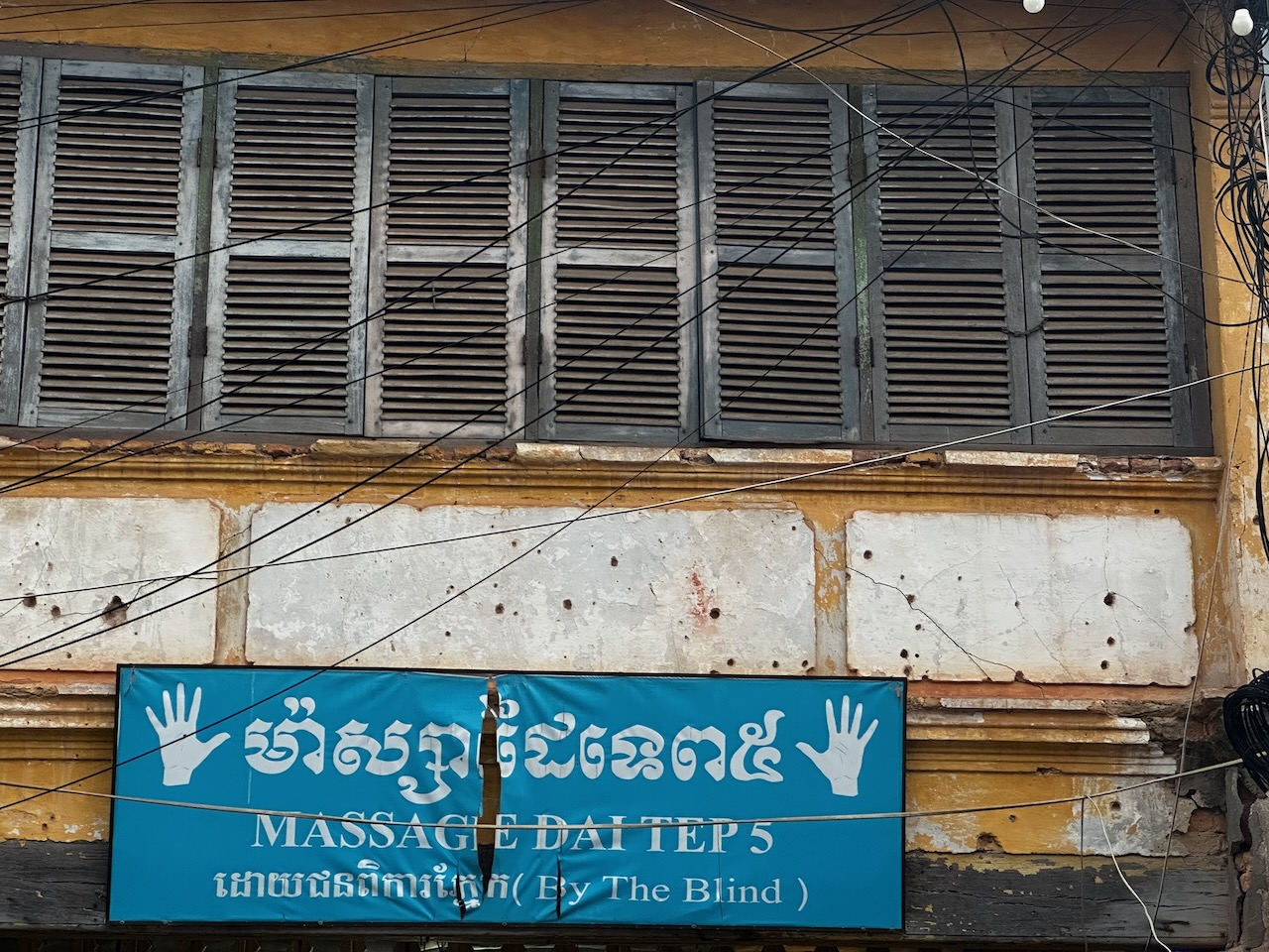 Am Abend spazieren wir zum Fluss und ich esse Heidelbeerkuchen mit Glacé. Auf dem Weg finden sich noch Schusslöcher aus dem Bürgerkrieg an einigen Häusern.