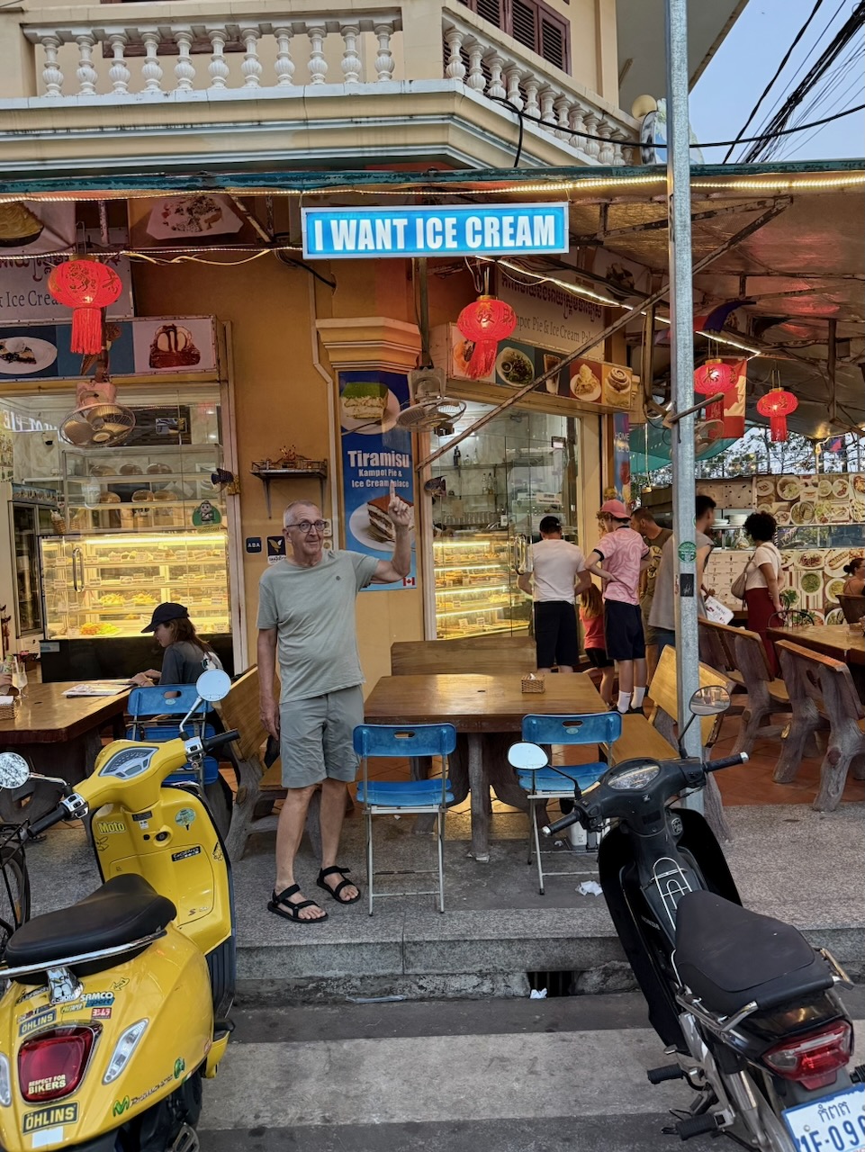 Auch Barbara gefällt das Frühstück im Epic Arts Café. Um 9 Uhr treffen wir Jason vor dem Kampot Pfeffer Laden für die Countryside Experience Tour. Mit dabei sind ein Walliser, zwei Franzosen und ein Kroate/Deutscher.