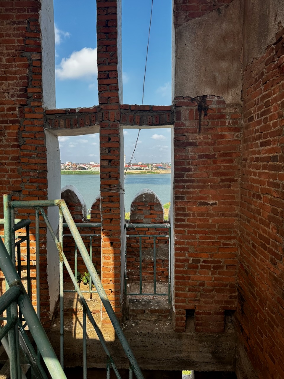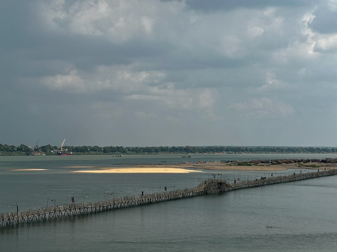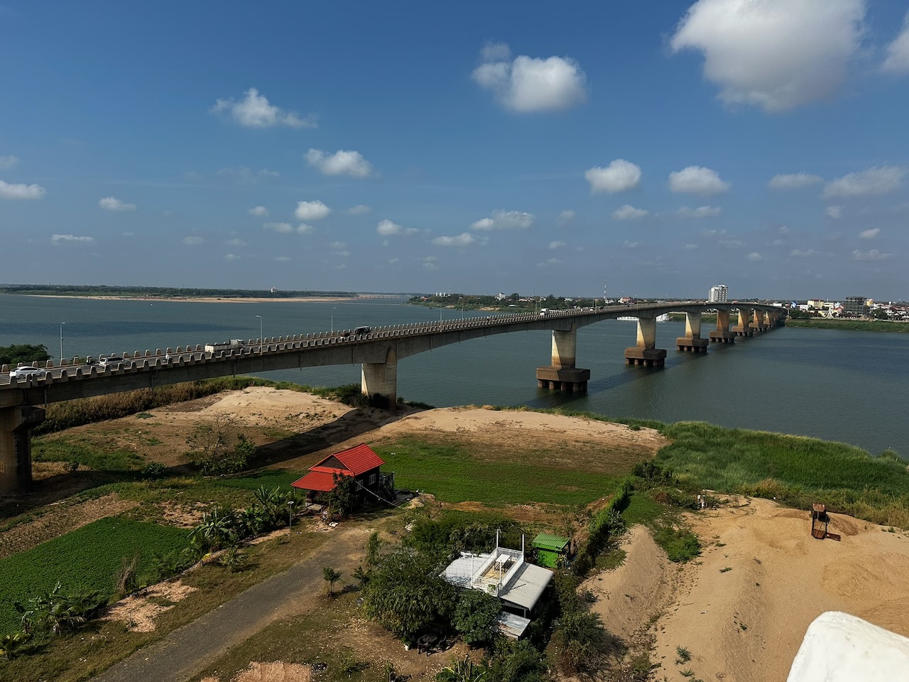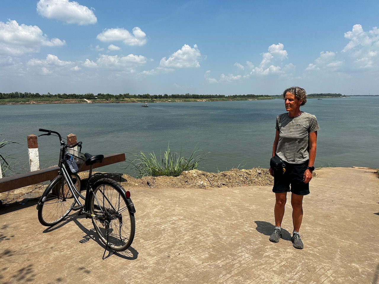 Nochmals sitzen wir aufs Velo. Wir fahren zur Kizuna-Brücke. Heute herrscht viel weniger Verkehr als an dem Tag, an dem wir angekommen sind. Die Fahrt auf die andere Seite des Mekong ist weitgehend stressfrei. Gleich nach der Brücke steht auf der linken Seite der Französische Turm. Er soll im frühen 20. Jahrhundert als Wachtturm gebaut worden sein. Im Innern führen Stahltreppen, steil wie Leitern, zu einem Rundgang auf der Aussenseite. Die Aussicht ist fantastisch. Der Aufstieg braucht etwas Nerven, da man ziemlich in der Luft steht. Barbara bleibt unten und fotografiert.