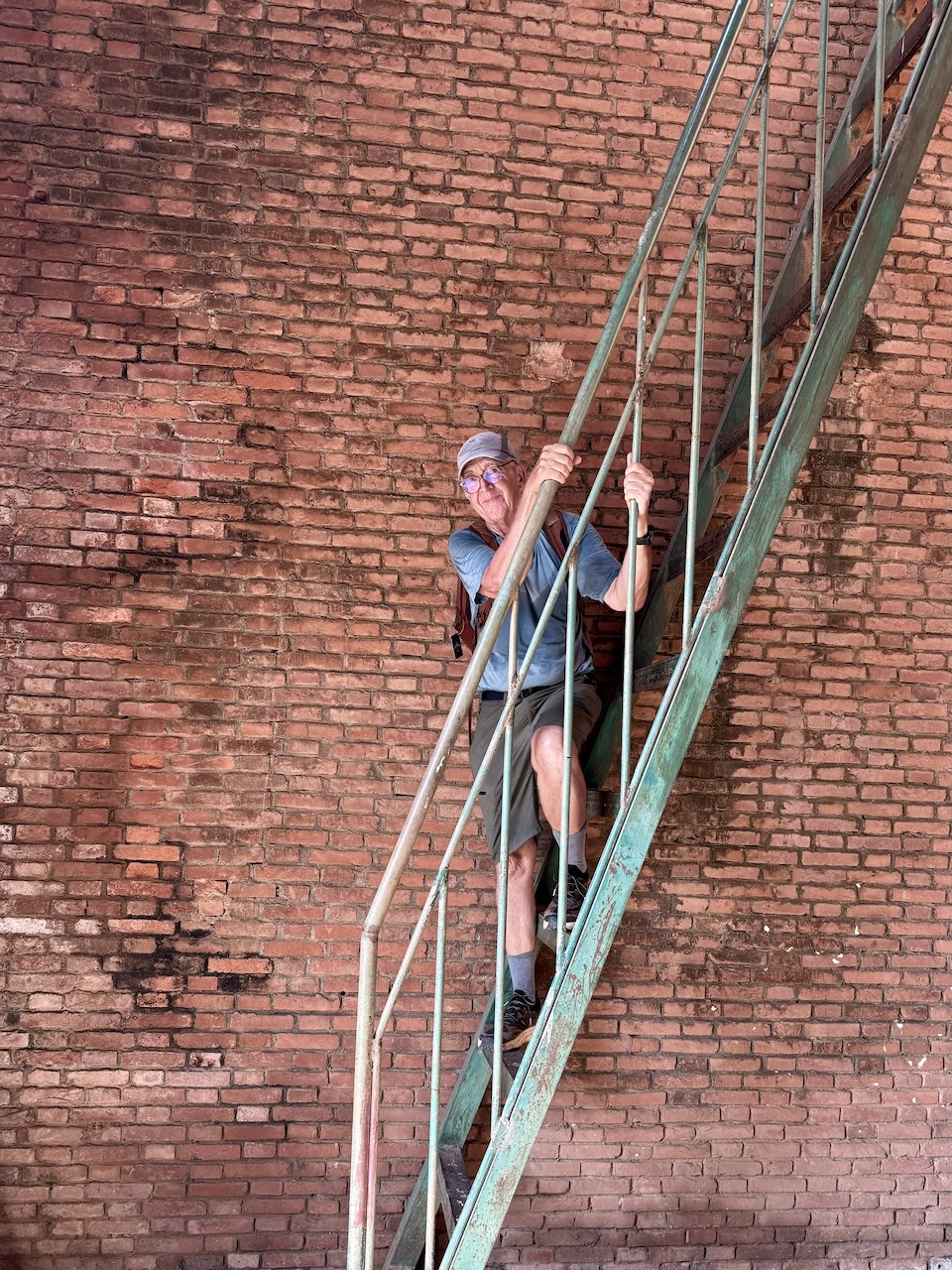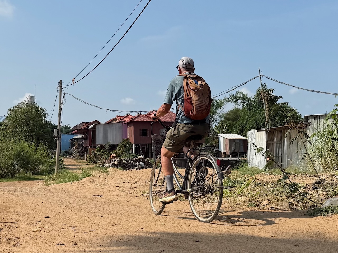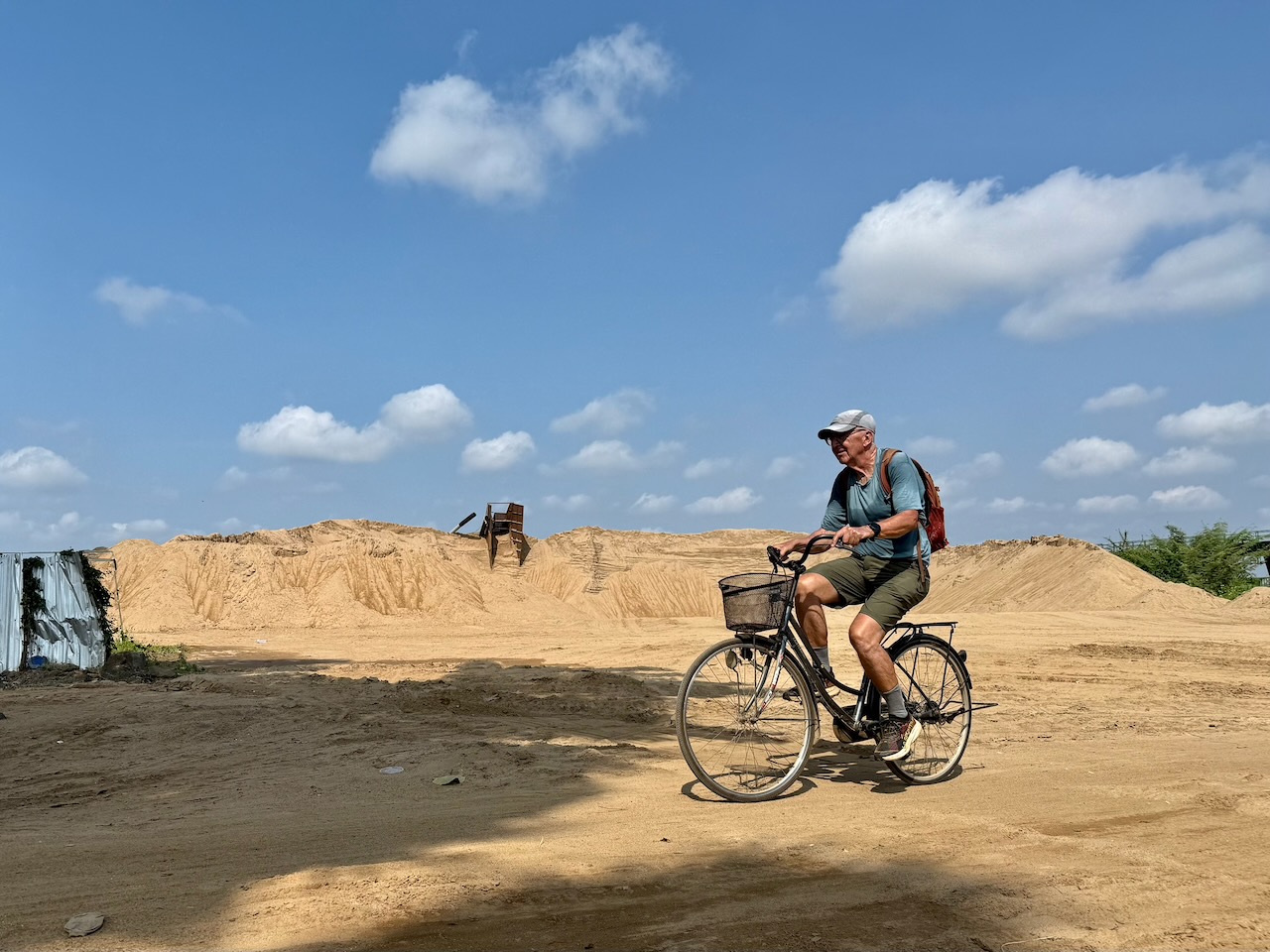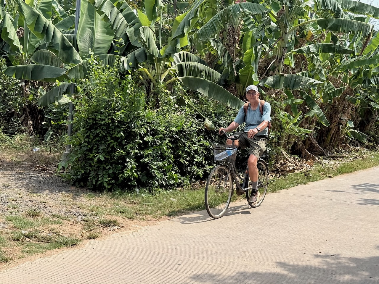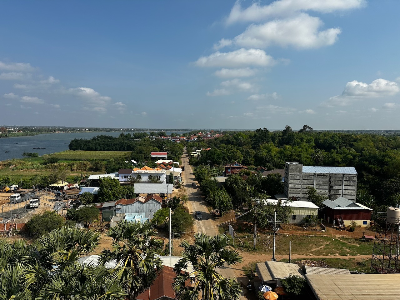 Nochmals sitzen wir aufs Velo. Wir fahren zur Kizuna-Brücke. Heute herrscht viel weniger Verkehr als an dem Tag, an dem wir angekommen sind. Die Fahrt auf die andere Seite des Mekong ist weitgehend stressfrei. Gleich nach der Brücke steht auf der linken Seite der Französische Turm. Er soll im frühen 20. Jahrhundert als Wachtturm gebaut worden sein. Im Innern führen Stahltreppen, steil wie Leitern, zu einem Rundgang auf der Aussenseite. Die Aussicht ist fantastisch. Der Aufstieg braucht etwas Nerven, da man ziemlich in der Luft steht. Barbara bleibt unten und fotografiert.