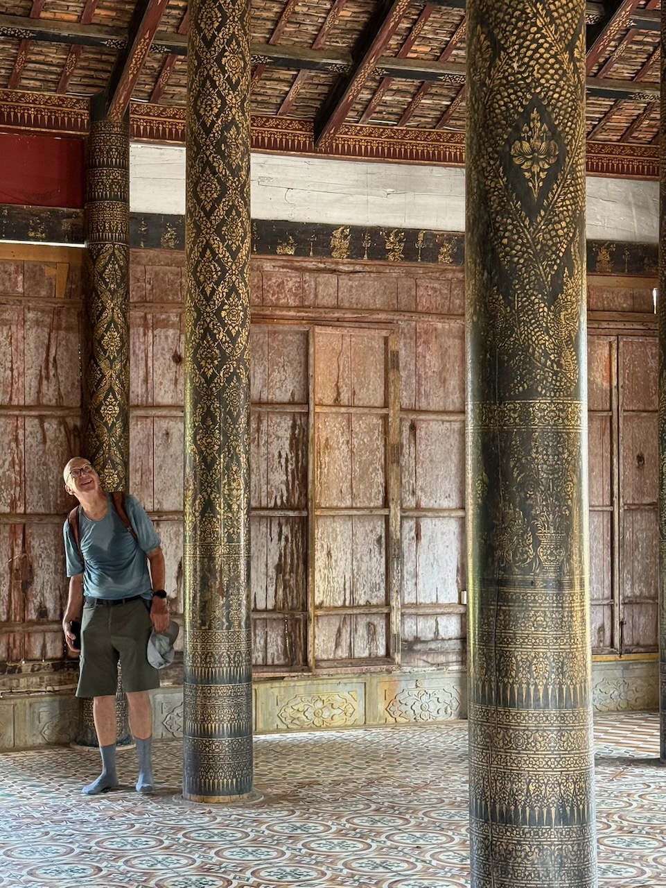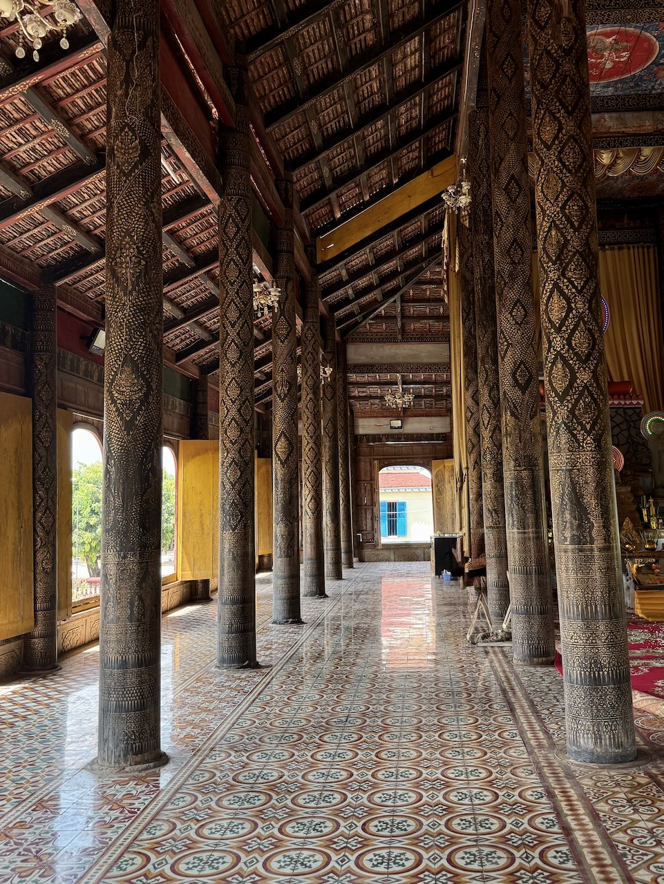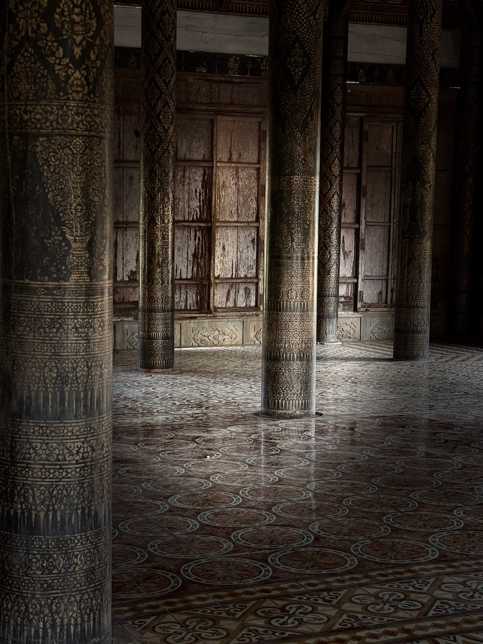 Der Bau dieses Tempels begann 1894. Der imposante, fünfundzwanzig Meter lange Tempel, der von sechzig Holzpfosten mit einem Durchmesser von dreissig bis vierzig Zentimetern getragen und von Bretterwänden umschlossen wird, ist der einzige vollständig aus Holz erbaute antike Tempel in Kambodscha, der erhalten geblieben ist. Die ganze Tempelanlage ist riesig, es ist sehr ruhig hier und wir rasten im Schatten.