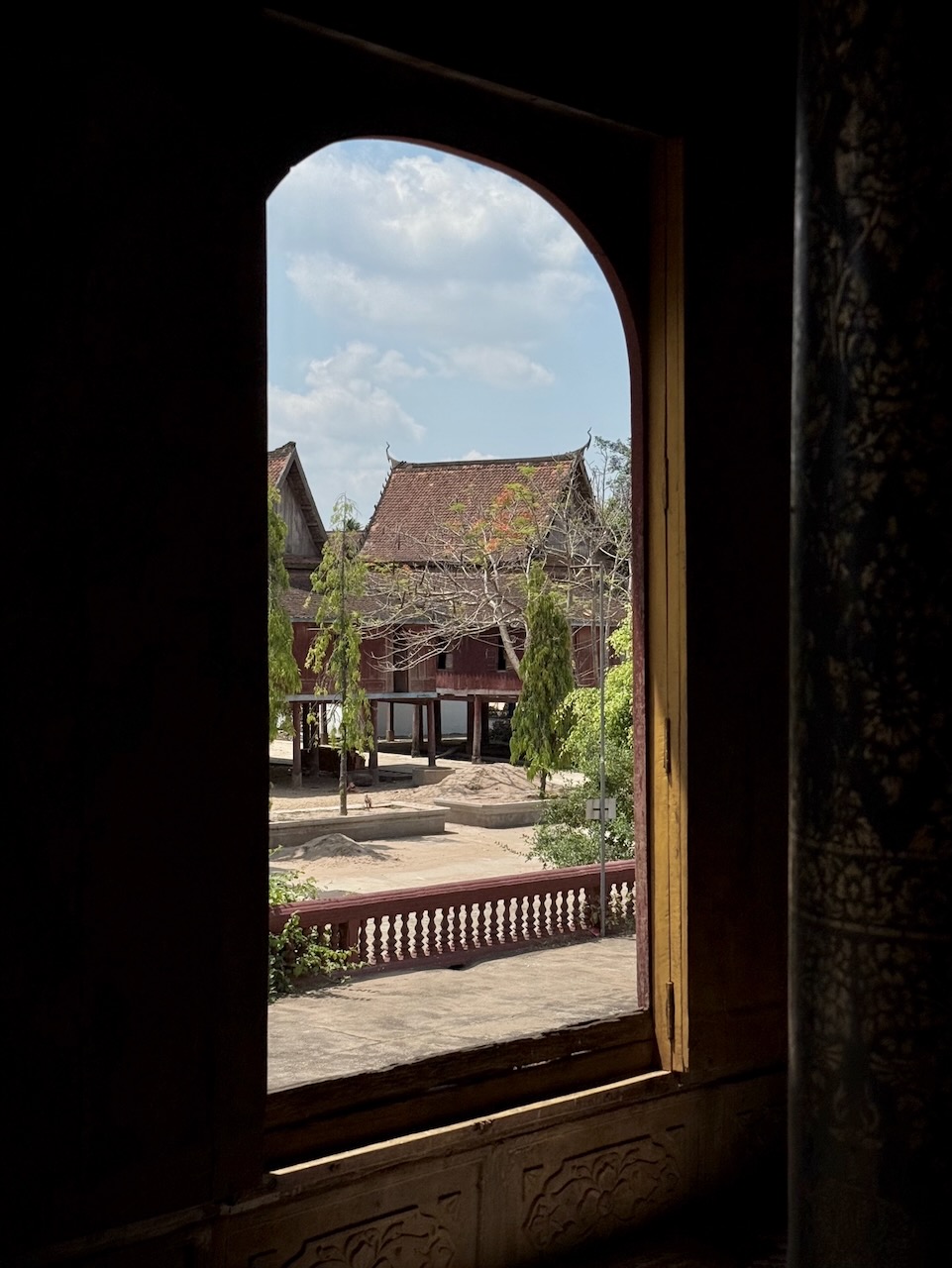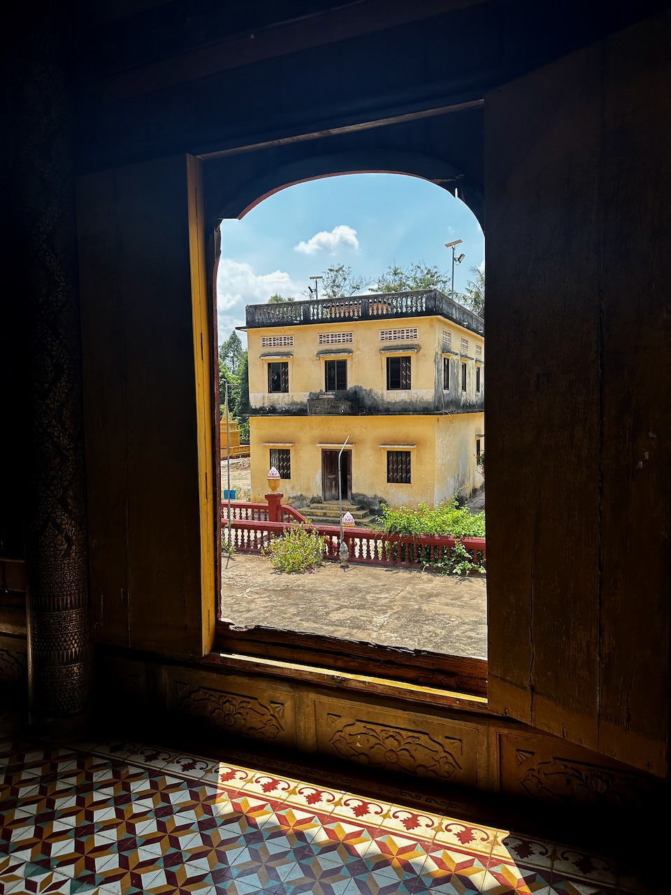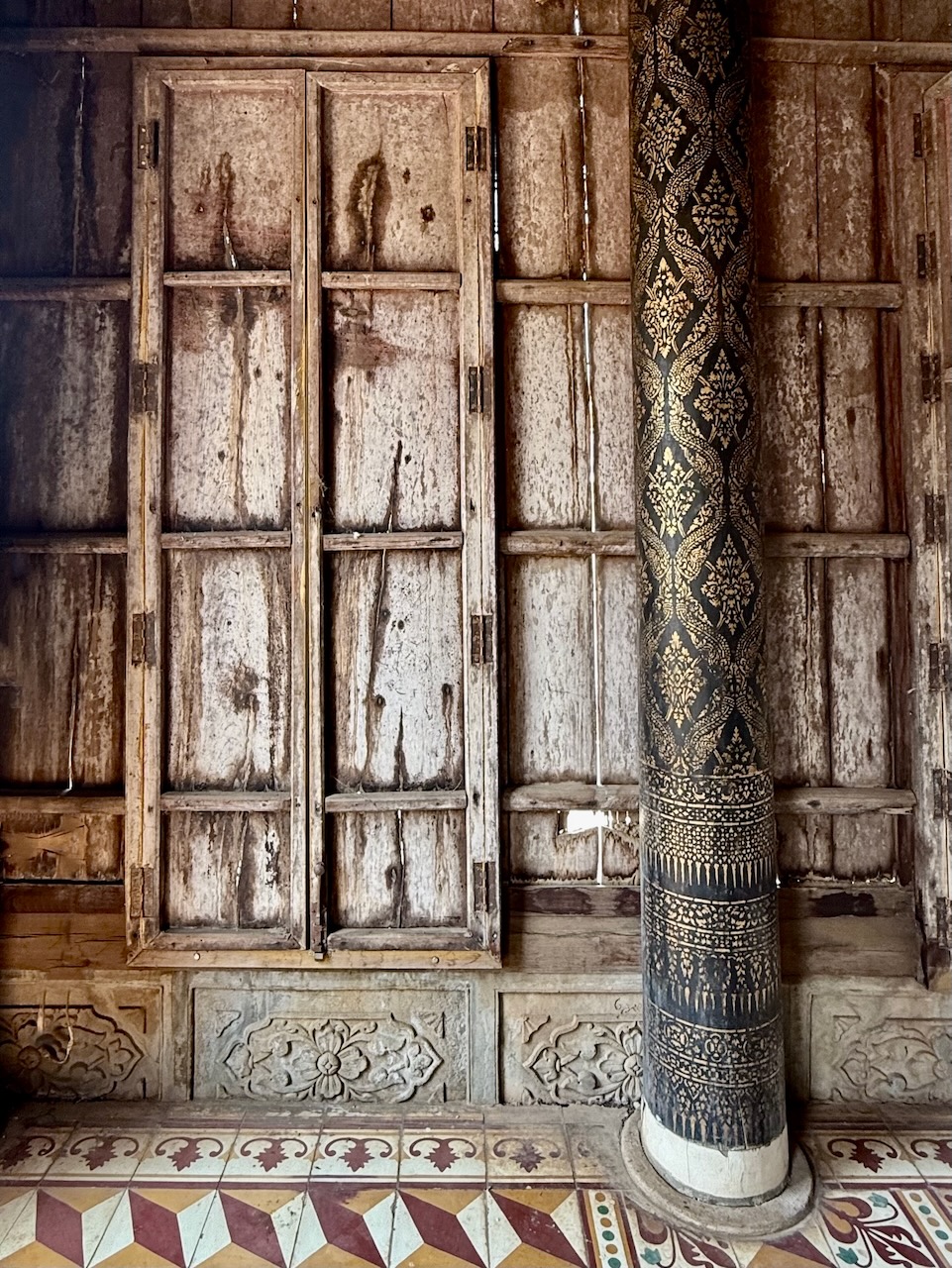 Der Bau dieses Tempels begann 1894. Der imposante, fünfundzwanzig Meter lange Tempel, der von sechzig Holzpfosten mit einem Durchmesser von dreissig bis vierzig Zentimetern getragen und von Bretterwänden umschlossen wird, ist der einzige vollständig aus Holz erbaute antike Tempel in Kambodscha, der erhalten geblieben ist. Die ganze Tempelanlage ist riesig, es ist sehr ruhig hier und wir rasten im Schatten.