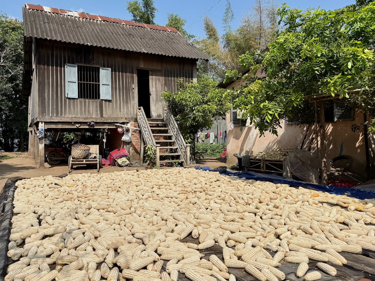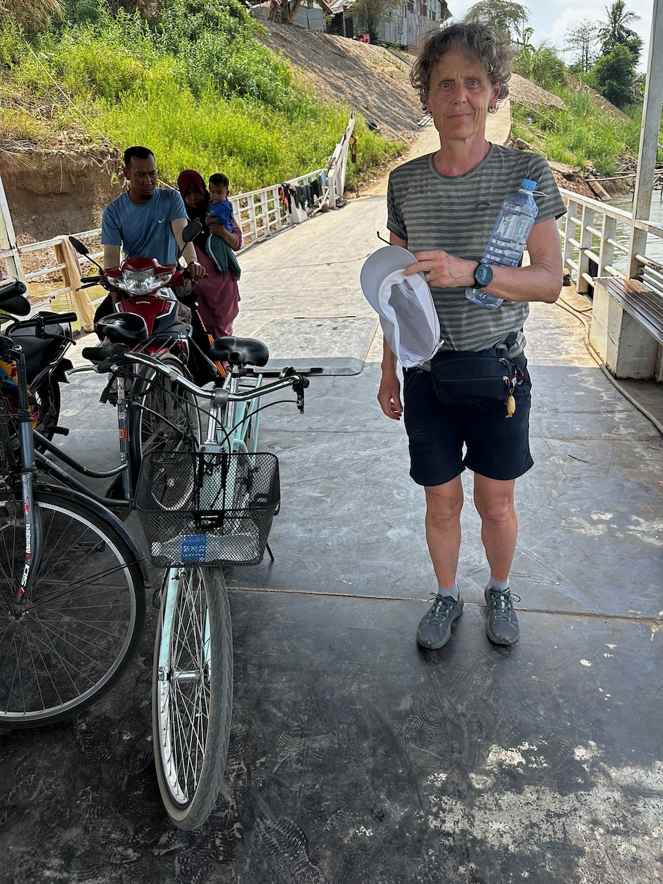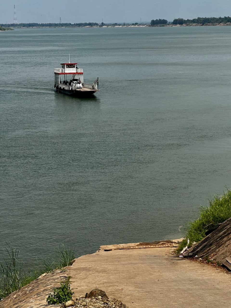 Wir fahren zurück zur Tela Tankstelle. Jetzt überqueren wir die Brücke über den kleinen Mekong-Zufluss und folgen der Strasse durch weite Felder (Mais, Reis, Erdnüsse) bis zum Mekong. Hier fährt eine Fähre zur Kog Pen Insel. Die Fähre ist gerade mitten im Fluss auf dem Weg zur anderen Seite. Wir warten oberhalb der steilen Zufahrtsstrasse. Nach einer Weile kommt sie zurück und wir fahren auf die Fähre. Wir bleiben etwa 20 Minuten stationiert, bis sich einige Motorräder und ein Auto dazu gesellt haben, dann geht es über den Fluss.