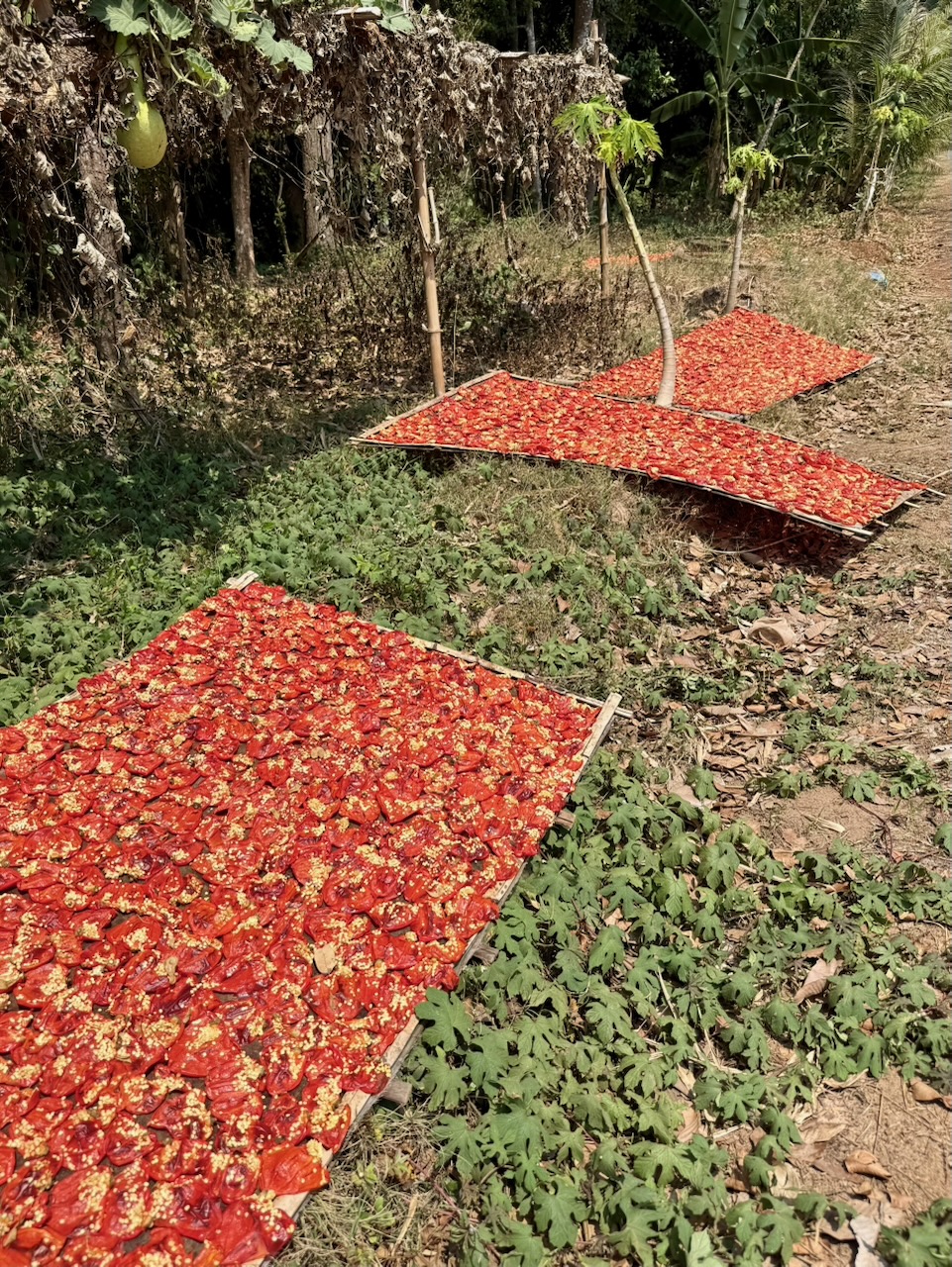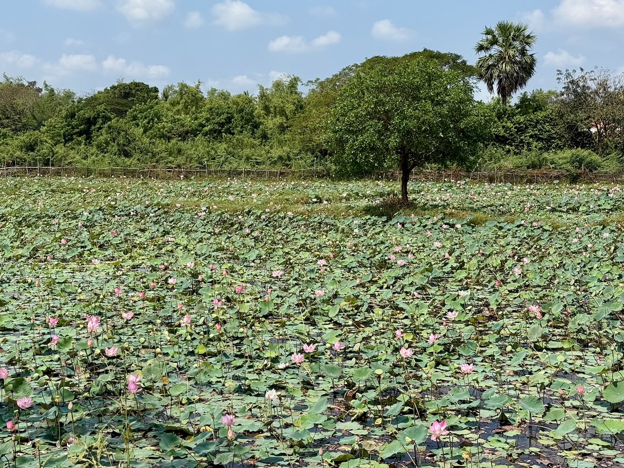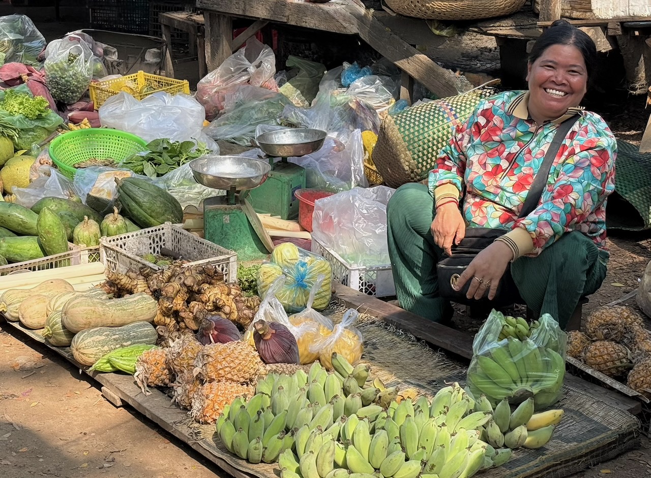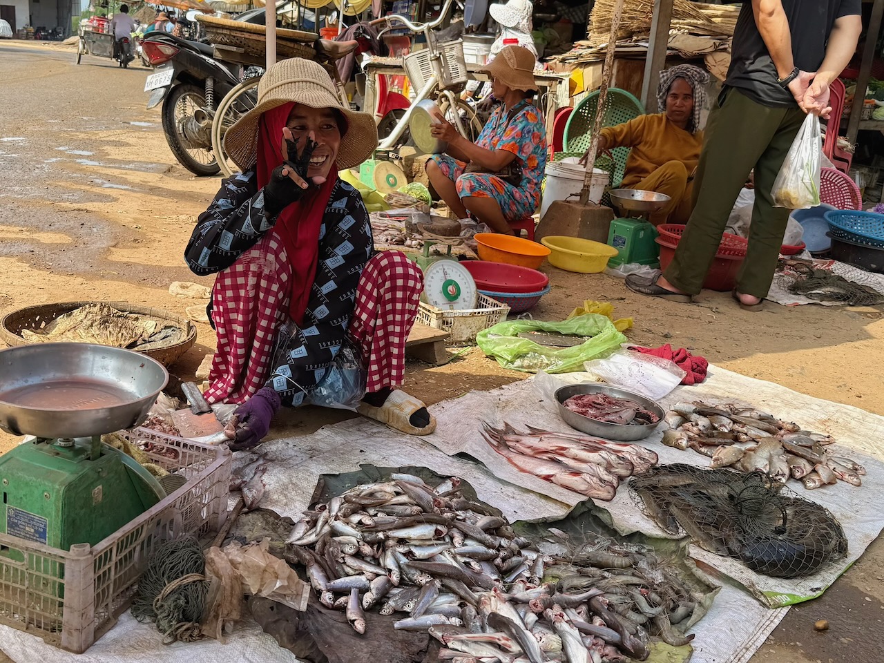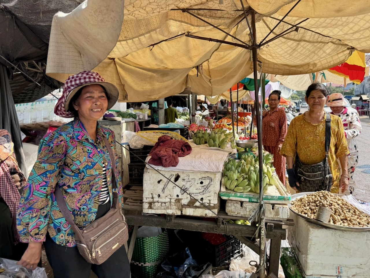 Wir folgen dem Mekong nach Süden. Der Weg führt kurz weg vom Fluss in ein Dorf, wo gerade Markt ist. Die Marktfrauen freuen sich über den Besuch von zwei Westlern und sind sehr freundlich. Wir kaufen Mandarinen. Auf der Strasse geht es weiter, es ist heiss. Einmal stoppen wir für Getränke, aber der Energy Drink behagt Barbara nicht besonders. An einer Tela Tankstelle erhalten wir gratis zwei Sportgetränke von einem Team, das gerade dafür Werbung macht. Gegenüber können wir auch Wasser kaufen. Wir biegen vor der Brücke links ab, weil wir zur Moha Leap Pagoda wollen.