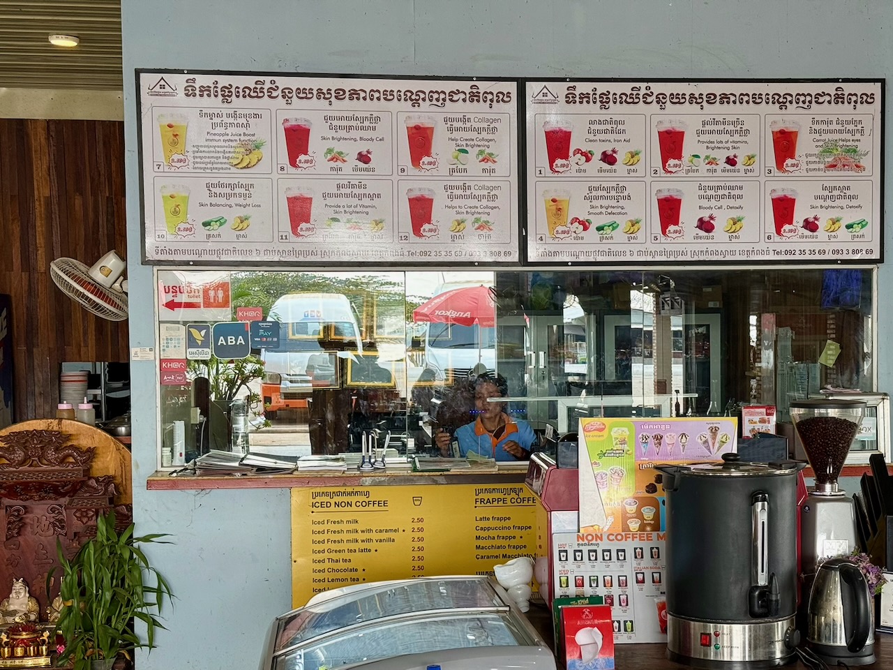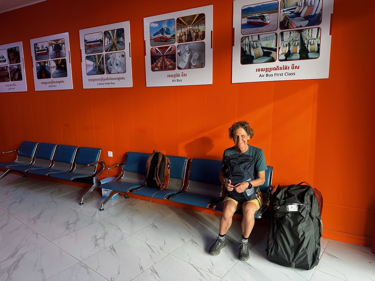 Der Fahrplan des VET Bus ist verwirrend, auf dem Ticket und in der App ist die Abfahrtszeit nach Siem Reap mit 8.30 eingetragen, im Internet und gemäss Thomas vom Phalla Riverside soll der Bus um 8 Uhr abfahren. Wir sind auf jeden Fall früh genug beim Frühstück und mit dem Tuk Tuk um 7.30 an der Busstation. Also, der Bus fährt um 8 Uhr. Wir fahren ziemlich pünktlich los. Ausser uns hat es noch zwei junge Frauen, die aber bald wieder aussteigen. Bei diesem Halt steigt ein Mann ein, der wohl zur Busfirma gehört. So sind wir also die einzigen Passagiere nach Siem Reap. Die Landschaft kennen wir schon: flach, Reisfelder, Obstkulturen, Mais, Tapioka…