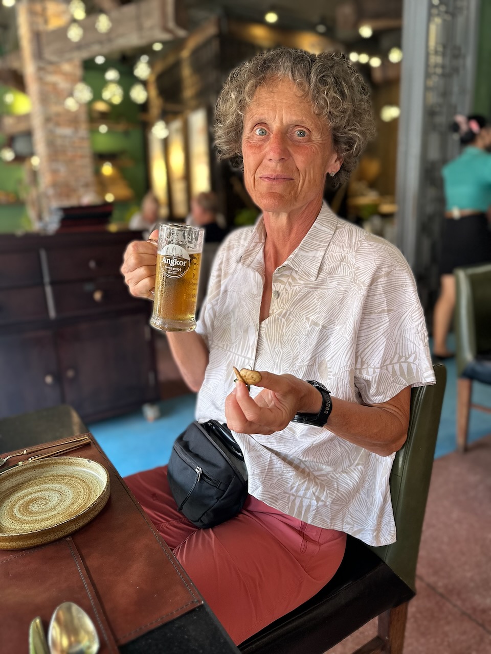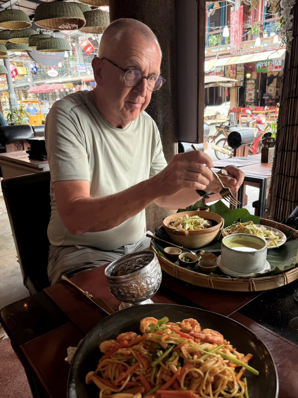 Wir werden von Chris begrüsst, plaudern mit ihm und beziehen unser Luxuszimmer. Nach der Dusche fahren wir per Tuk Tuk in die Stadt (7200 Riel) und lassen uns im Restaurant Mesa verwöhnen. Man isst hier wirklich ausgezeichnet, und die Angestellten kümmern sich fast übereifrig um einen. Deep Fried Crispy Spring Rolls, Fried Noodle with Prawns, Khmer Rice Noodle with Fish, Mango Ice Cream, Mango Cheesecake with Icecream. Dazu 2 Bier, Passionsfrucht Smoothie, 2 Espresso, ausserdem wird ein Passionsfruchtsaft und ein Maniokdessert spendiert. Gesamtpreis 36 $.