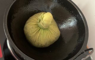 Diese Behandlung nennt sich Kizhi und verwendet erhitztes Öl, welches mit Kräutern angereichert wurde. Die Säcklein können ganz schön heiss sein, werden gegen Entzündungen und Schmerzen angewendet und fördern die Blutzirkulation. Weiter geht es in Rückenlage.