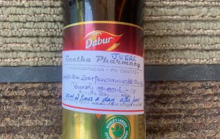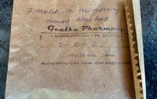Meine Ayurveda Medizin ist auch bereit und ich kann eine Flasche mit einem Kräuterwein und ein Briefchen mit Tabletten abholen, nebst den Anweisungen, wie diese einzunehmen seien.