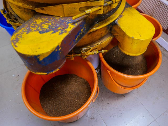 In einer grösseren Halle läuft ein Förderband, wo der Tee getrocknet und sortiert wird. Ein grosser Laden bietet viel Teesorten zum Kauf an.