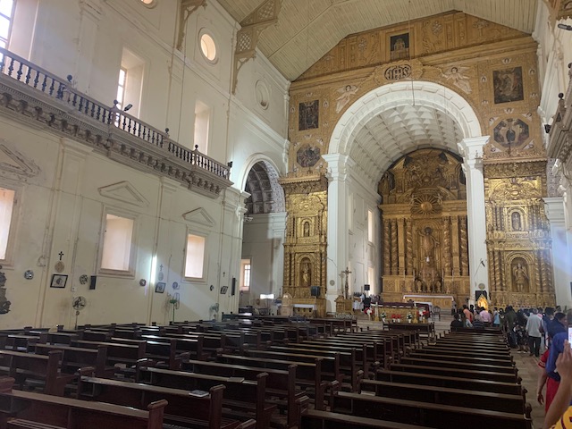 Shree Mangueshi ist der nächste Halt, dann fahren wir nach Old Goa, wo die christliche Religion dominiert und es massenhaft Kirchen und Kappellen hat. Die Basilica do Bom Jesus ist eine beeindruckend riesige, dunkelrote barocke Jesuitenkirche aus dem 17. Jh.